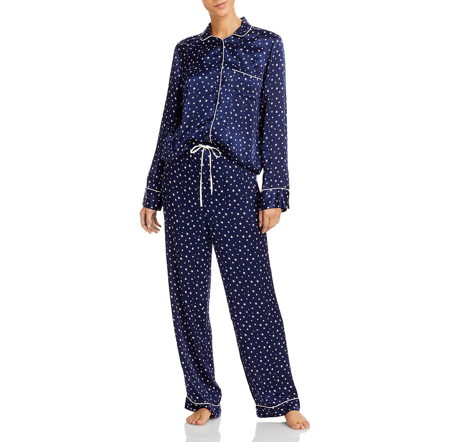 A starry print shines against a midnight background on these smooth pjs textured in a luxe satiny finish.