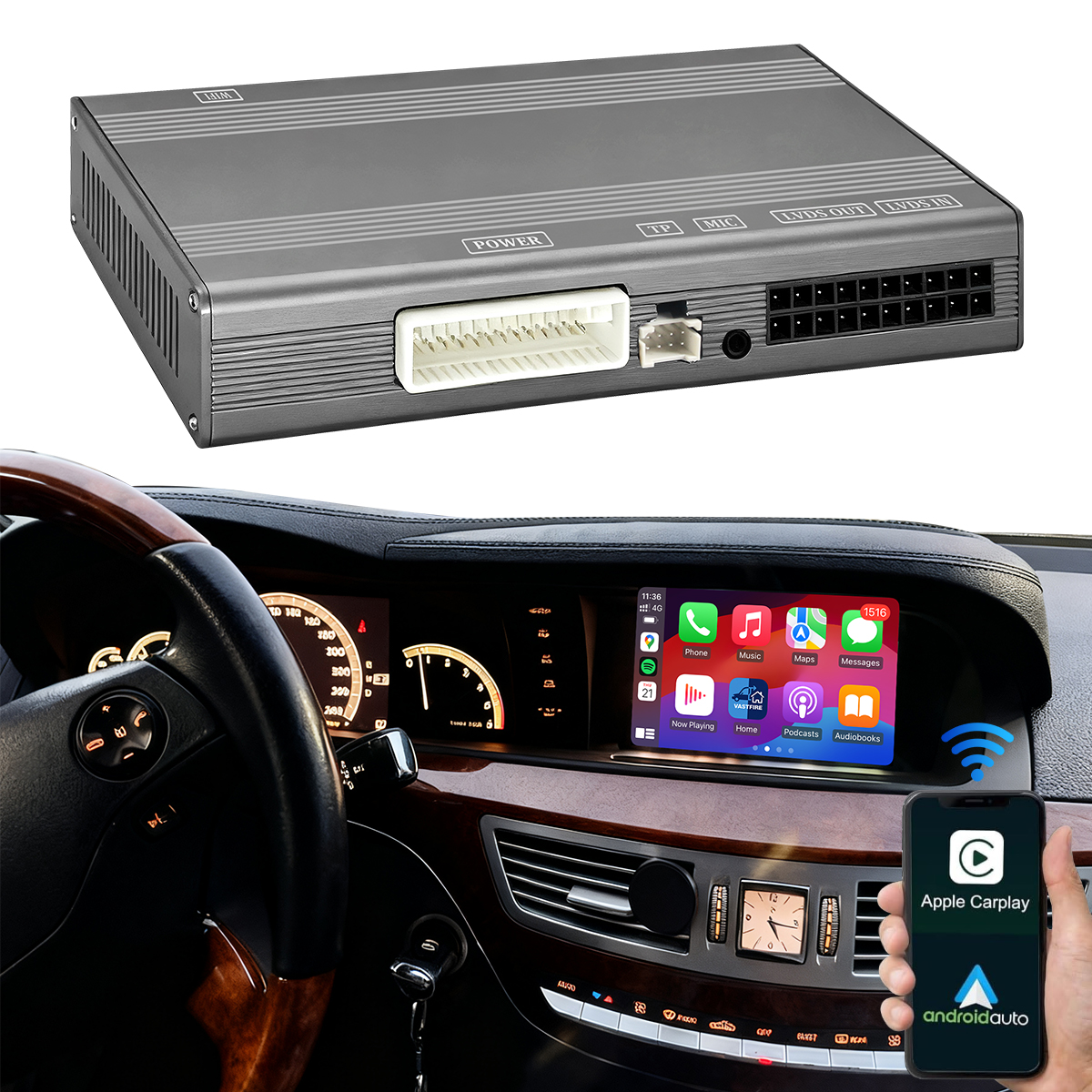 Die einfache Steuerung über den integrierten SWC/OEM-Touchscreen des Fahrzeugs bietet erweiterte CarPlay- und Android Auto-Funktionen, während der Original-Fahrzeugbildschirm nahtlos erhalten bleibt.