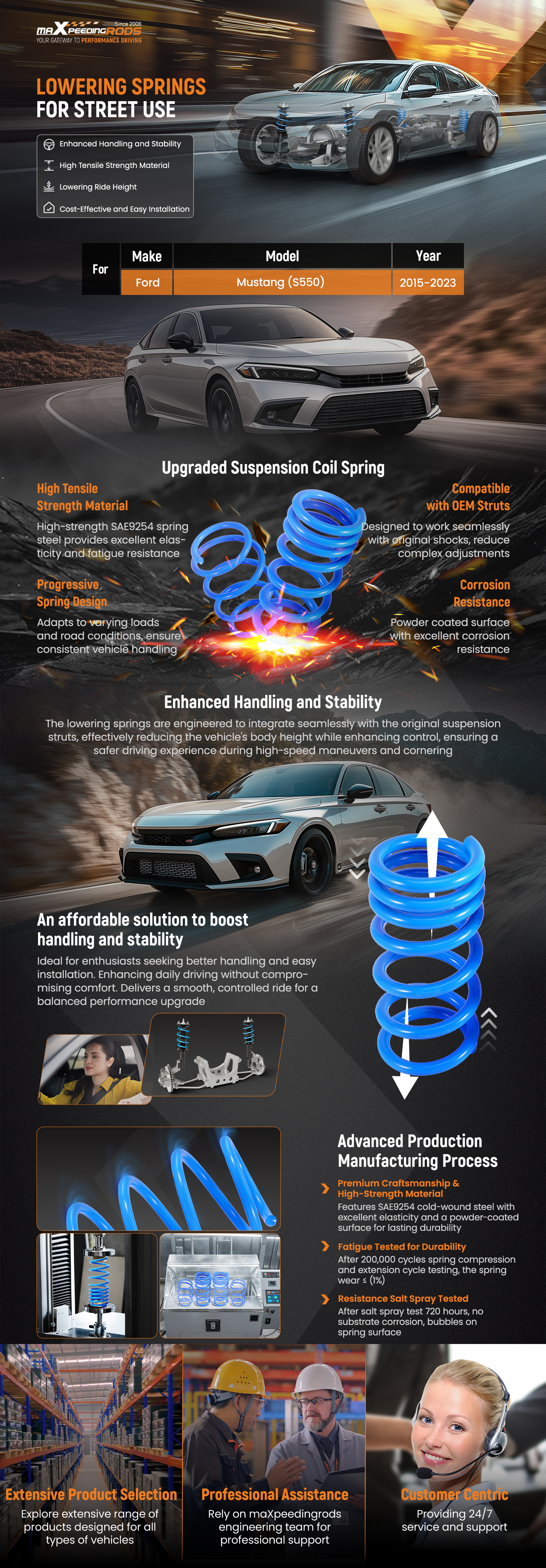 These springs effectively lower your vehicle's center of gravity, improving cornering stability and reducing body roll for a more responsive and controlled driving experience.