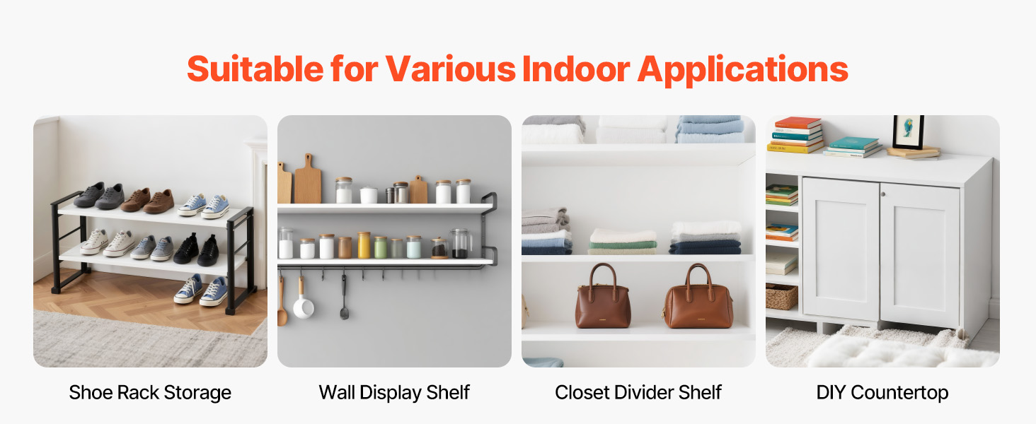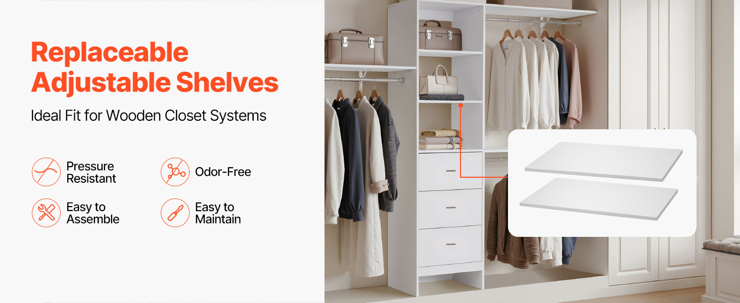 Crafted from durable high-density particleboard, these versatile melamine shelves offer reliable support for clothing, footwear, handbags, and other accessories. The shelves can be adjusted or tailored to suit your specific requirements. Their smooth, splinter-resistant edges ensure hassle-free cutting and assembly, minimizing the risk of accidental scratches during installation.