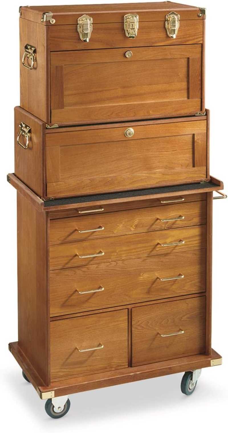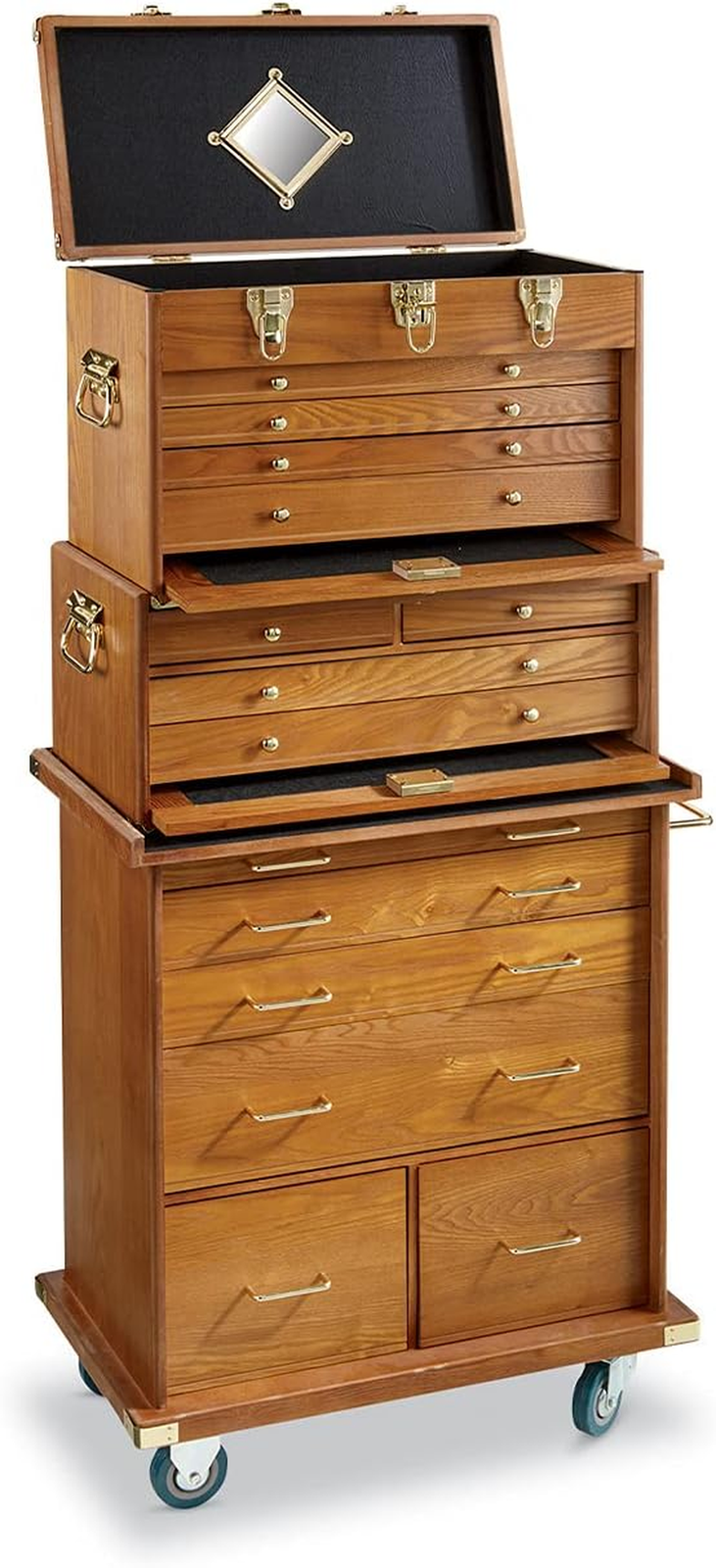 FELT LINED INNER SPACE – The drawer organizers are all felt-lined to keep your collection safe from scratches. Brass-tone metal pulls, latches, locks, carry handles and corner reinforcements.