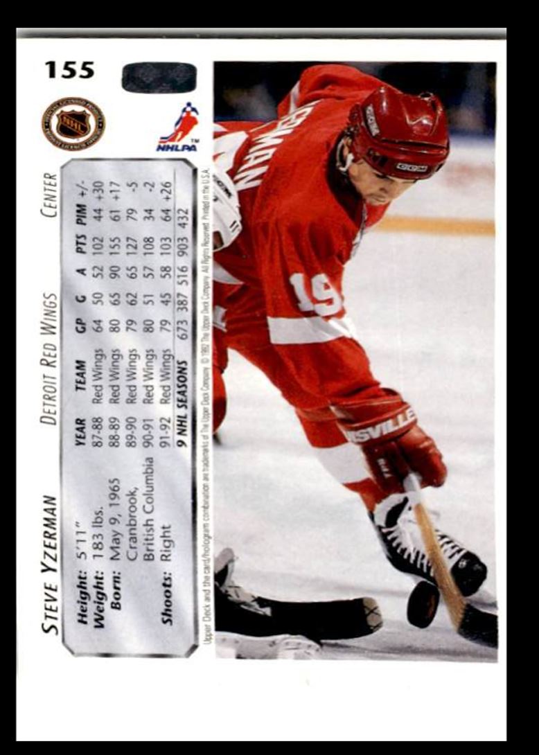 | Description: | Steve Yzerman | | Category: | Hockey | | Year: | 1992 | | Product: | Upper Deck | | Team: | Detroit Red Wings | | Card Number: | 155 | | Dimensions: | 3½" x 2½" |