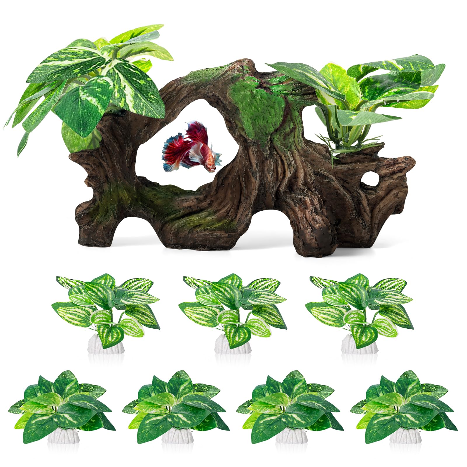 8 Pcs Silk aquarium plants set: Containing artificial driftwood - 6.3 x 2.8 x 3.9 inches (L x W x H); 7 Pcs Silk plants - 2.4 inches tall