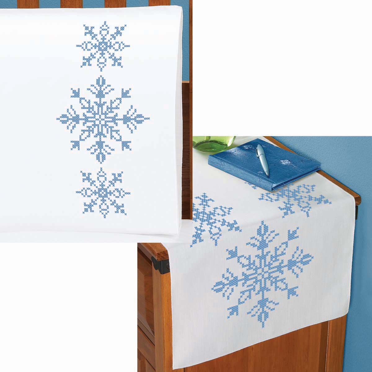 Save when you buy this bundled set that includes the pillowcases and dresser scarf. These cross-stitch bedroom designs feature a trio of blue snowflakes stitched in light blue. The coordinating pillowcases and bedroom linens bring a flurry of seasonal charm to your bedroom or can be used to decorate the guest room for winter guests. This set includes two 20 x 30" (51 x 76cm) pillowcases and one 14 x 44" (36 x 112cm) dresser scarf. The designs are stamped for cross-stitch on white polyester/cotton fabric with a perle edge. Both pillowcases and the dresser scarf are pre-finished and ready for stitching. Simply follow the easy-to-read chart and instructions to stitch the designs. Floss and needle are not included. Imported. • These cross-stitch pillowcases and dresser scarf are ready for stitching with blue snowflakes. • The pillowcases and dresser scarf are stamped for cross-stitch on pre-finished white polyester/cotton fabric with a perle edge. • Set includes pillowcases, dresser scarf, and instructions. Floss and needle not included. • Set contains 2 pillowcases and one dresser scarf. • Pillowcases measure 20 x 30" (51 x 76cm). Dresser scarf measures 14 x 44" (36 x 112cm).