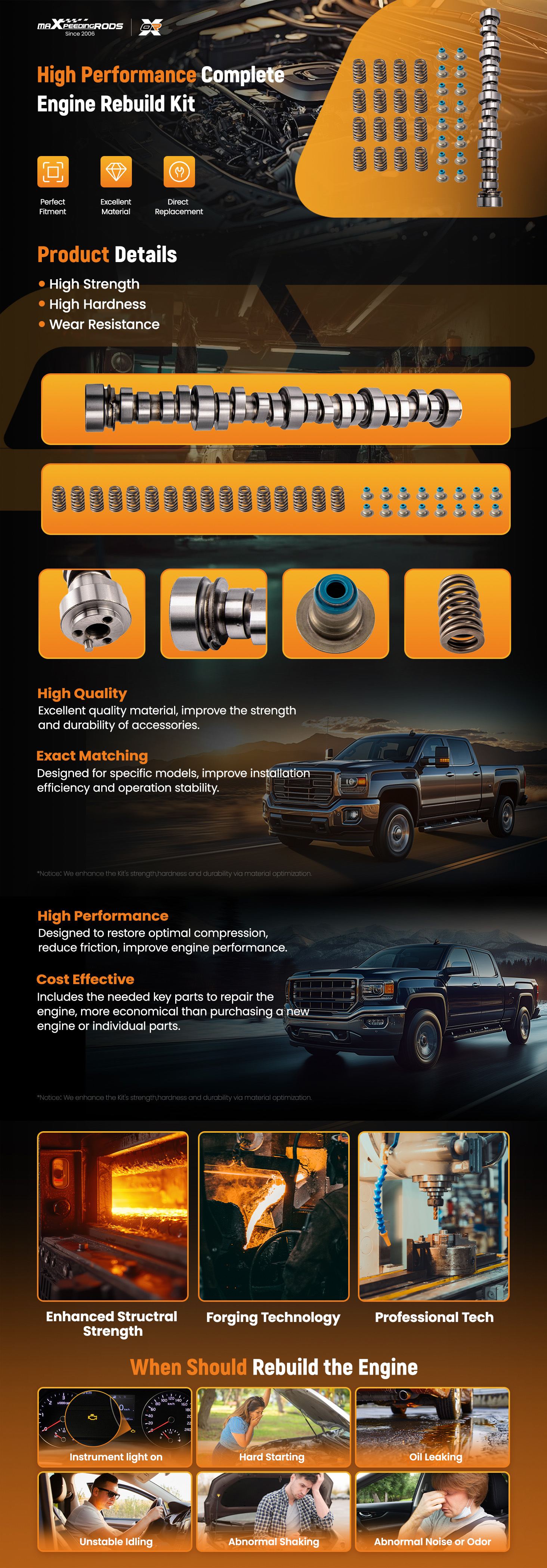 This Camshaft Kit are an excellent selection for GMC trucks and SUVs equipped with 4.8L, 5.3L, 5.7L, 6.0L, or 6.2L engines. These camshafts are designed to increase power without sacrificing low-end torque and are great choice for Silverado, Sierra, Yukon, Tahoe, Suburban, Escalade and other heavier vehicles.