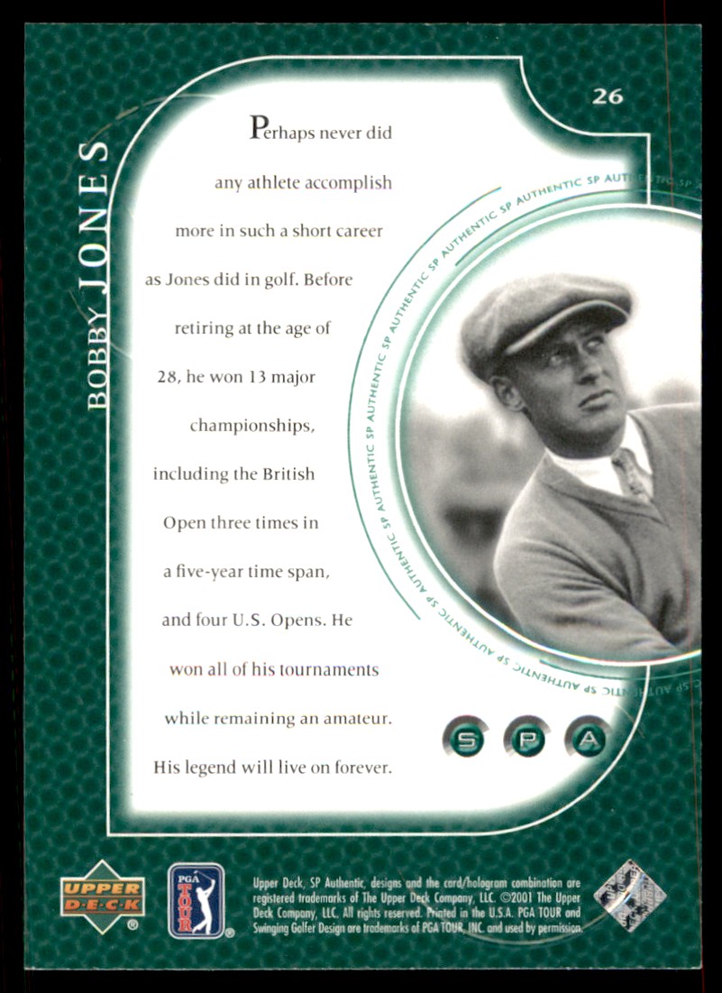 | Description: | Bobby Jones | | Category: | Golf | | Year: | 2001 | | Product: | SP Authentic | | Card Number: | 26 | | Dimensions: | 3½" x 2½" | | SKU: | GF B0003 R01 W (14) |
