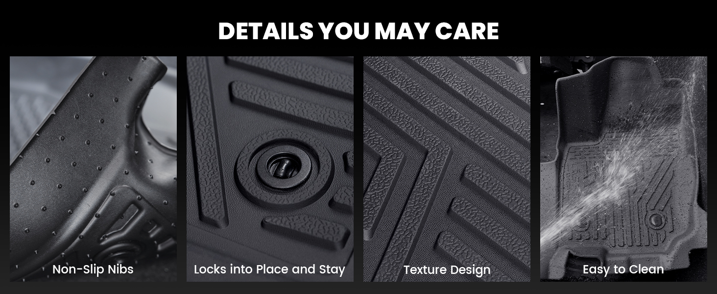 These durable floor mats Raised edges all the way around and have been upgraded to the use of innovative material, allowing our floor liners to last long, and way more durable that they won't curl or end up buckling.
