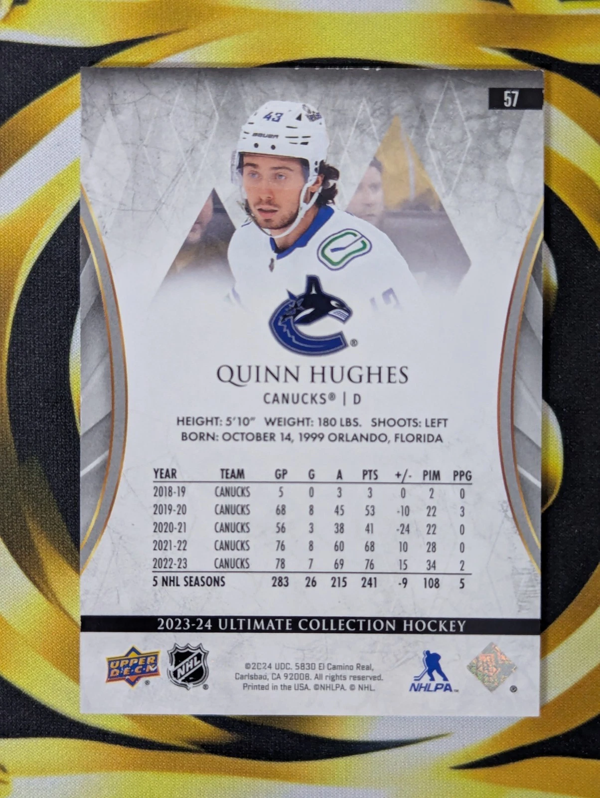 | Description: | Quinn Hughes | | Category: | Hockey | | Year: | 2023-24 | | Product: | Upper Deck Ultimate | | Team: | Vancouver Canucks | | Card Number: | 57 |