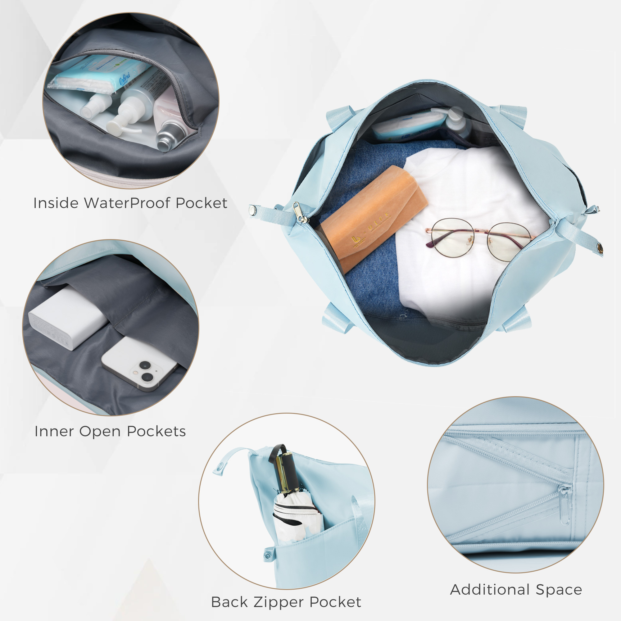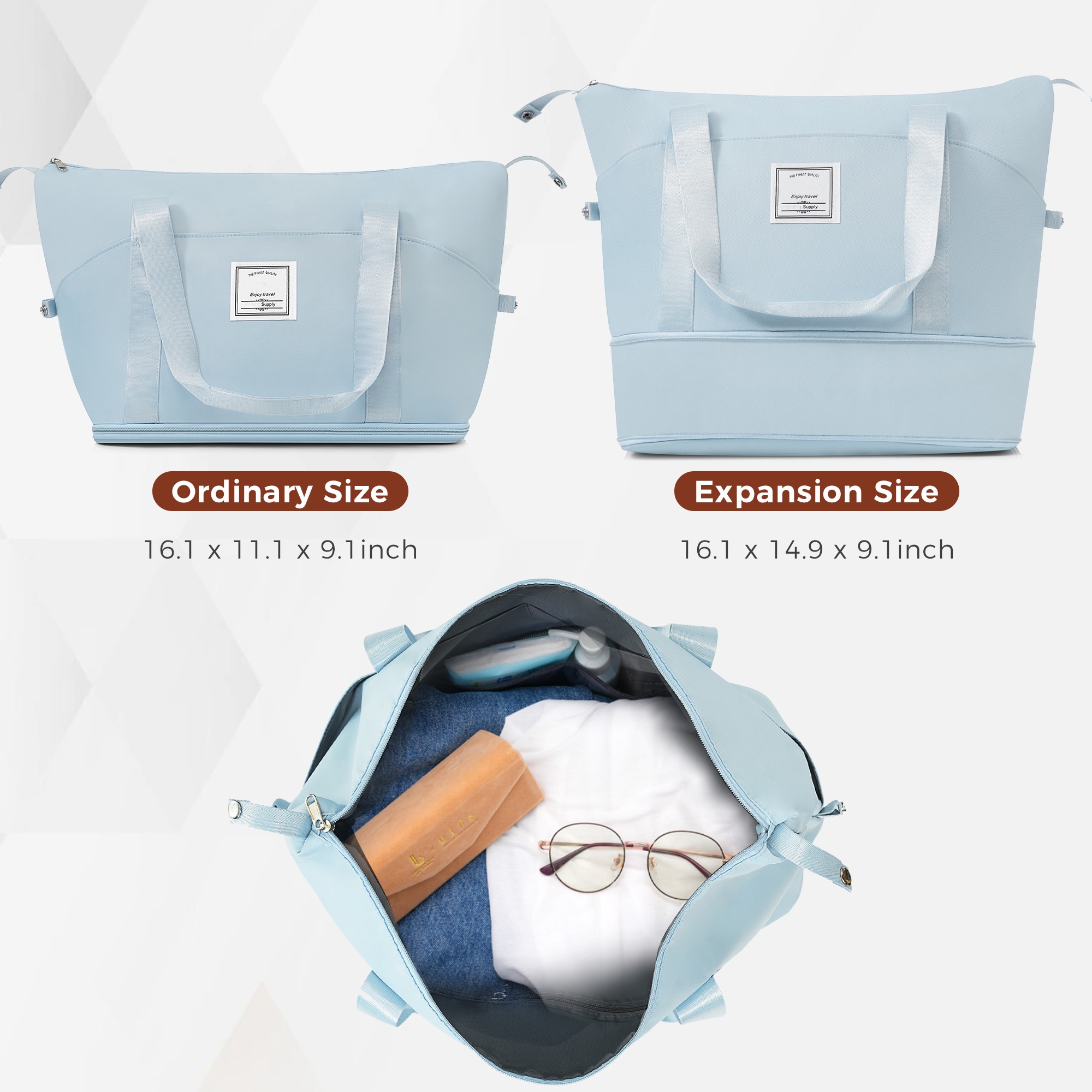 【Expandable weekender travel bag】 Made of polyester fabric, the bags are mild water-repellent with multiple pockets for organization.