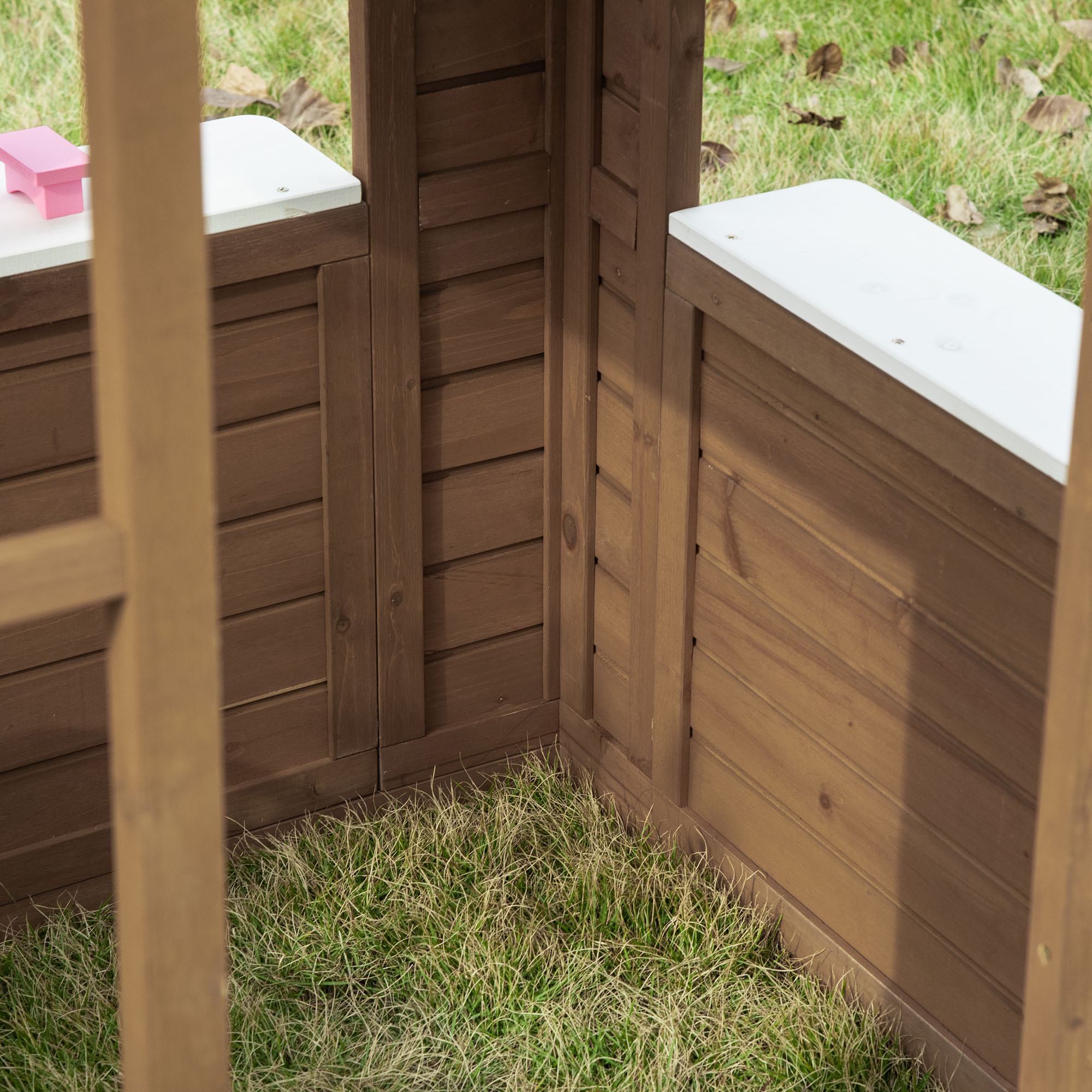 Kids will enjoy hours of playtime with this UIRIO wooden playhouse. Rest assured to leave your lovely baby in this outdoor playhouse to play with their friends. With tilt roof design and water-resistant coating for outdoor use. For easy access and better ventilation, built-in doors and windows also keep kids in good sight. Features flowerpot holders, serving station, bring kid the most realistic playing experience. Take this playhouse home to enjoy a sweet family time.
