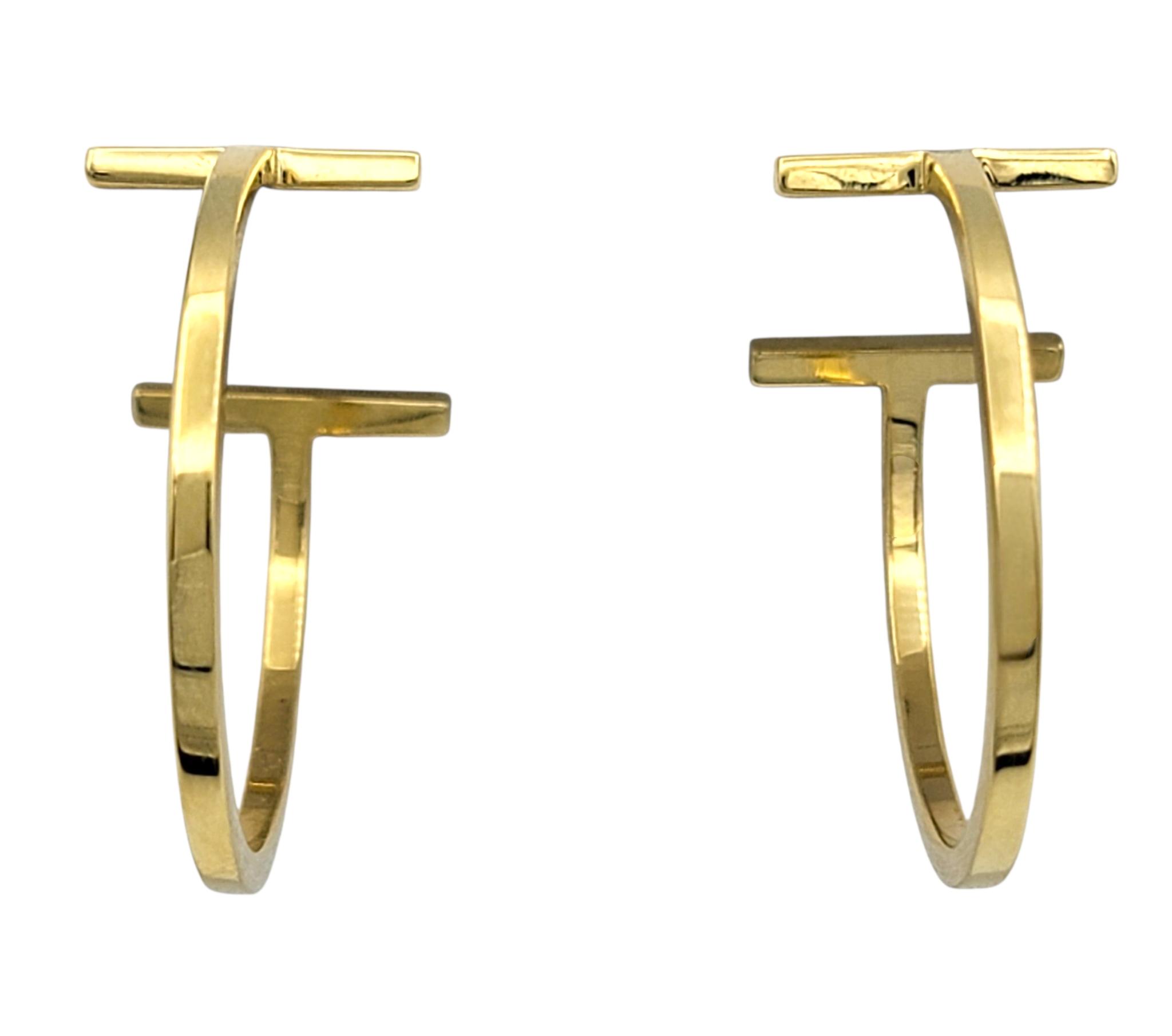 These elegant Tiffany & Co. earrings feature the iconic Tiffany T design in a sleek hoop style. The clean, architectural lines create a modern and sophisticated silhouette. Each hoop is accented with the signature “T” motif, giving the earrings a distinctive and recognizable look. Crafted in radiant yellow gold, the design feels both minimal and luxurious. The slender hoop shape provides graceful movement while remaining refined and understated.
