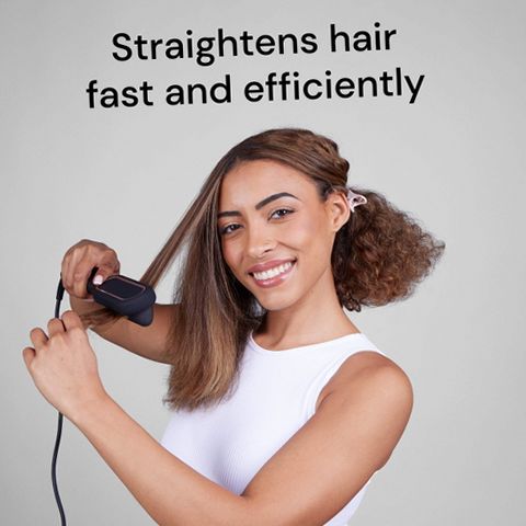 The L'ANGE HAIR Smooth-It 2-in-1 Digital Straightening Comb is engineered to deliver sleek, frizz-free hairstyles effortlessly. Equipped with negative ion technology, it neutralizes static and locks in shine while minimizing heat damage. The digital temperature dial allows precise adjustment between 230°F and 450°F to suit various hair textures and styling preferences. Its curved heated teeth glide smoothly from root to tip for comprehensive styling coverage. Additional features include a soft-touch ergonomic handle for comfort, a protective heat shield for safety during use, a professional-length 360° swivel cord for ease of movement, and an automatic shut-off after 60 minutes to prevent overheating. Dual voltage capability supports worldwide use, making this comb perfect for daily styling or travel. Crafted with durable aluminum plates and designed for all hair types, it offers fast and efficient straightening with polished results.