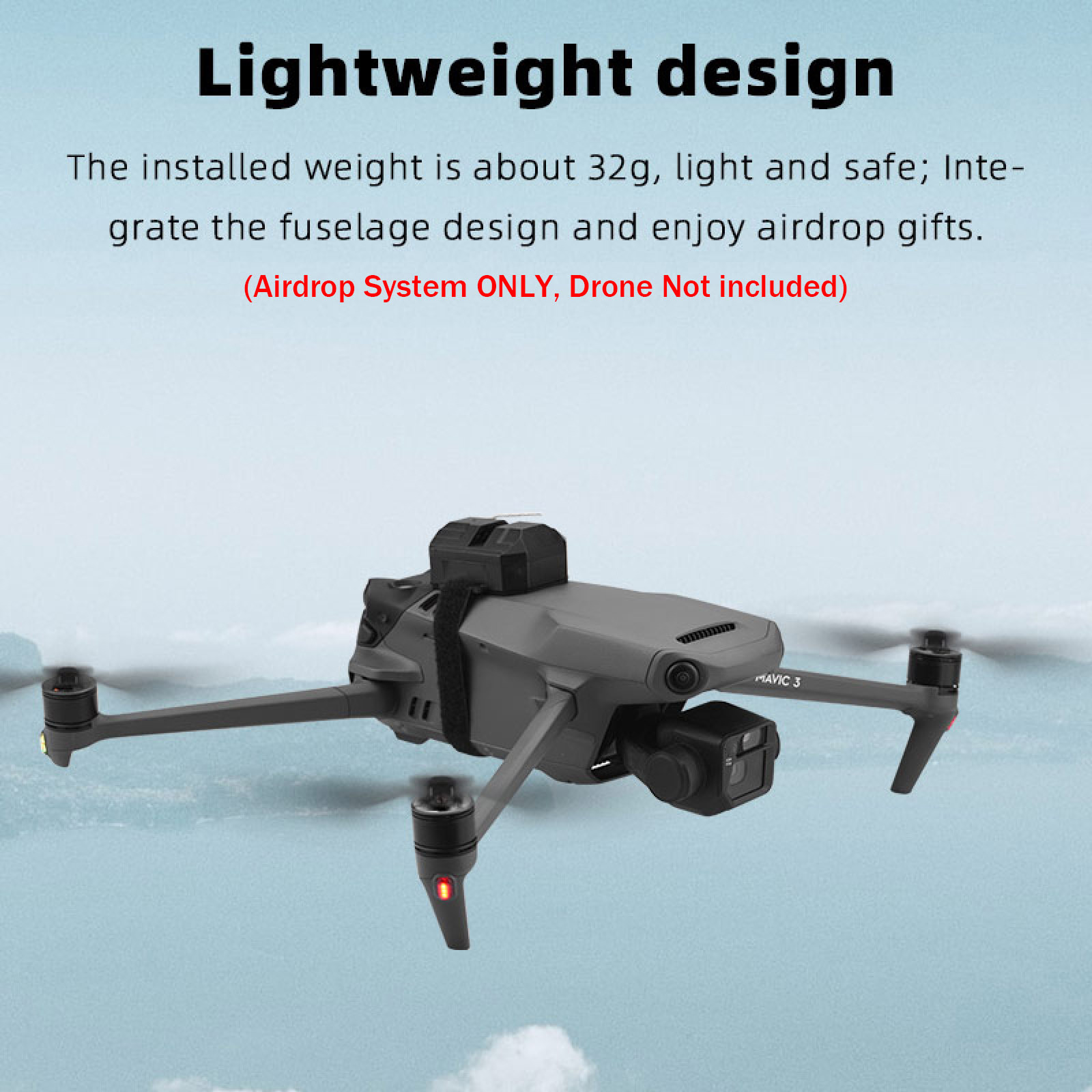4. The installation weight is about 32g, light and safe, and the fuselage design is integrated, which will not damage the drone, so you can get interesting airdrop gifts,