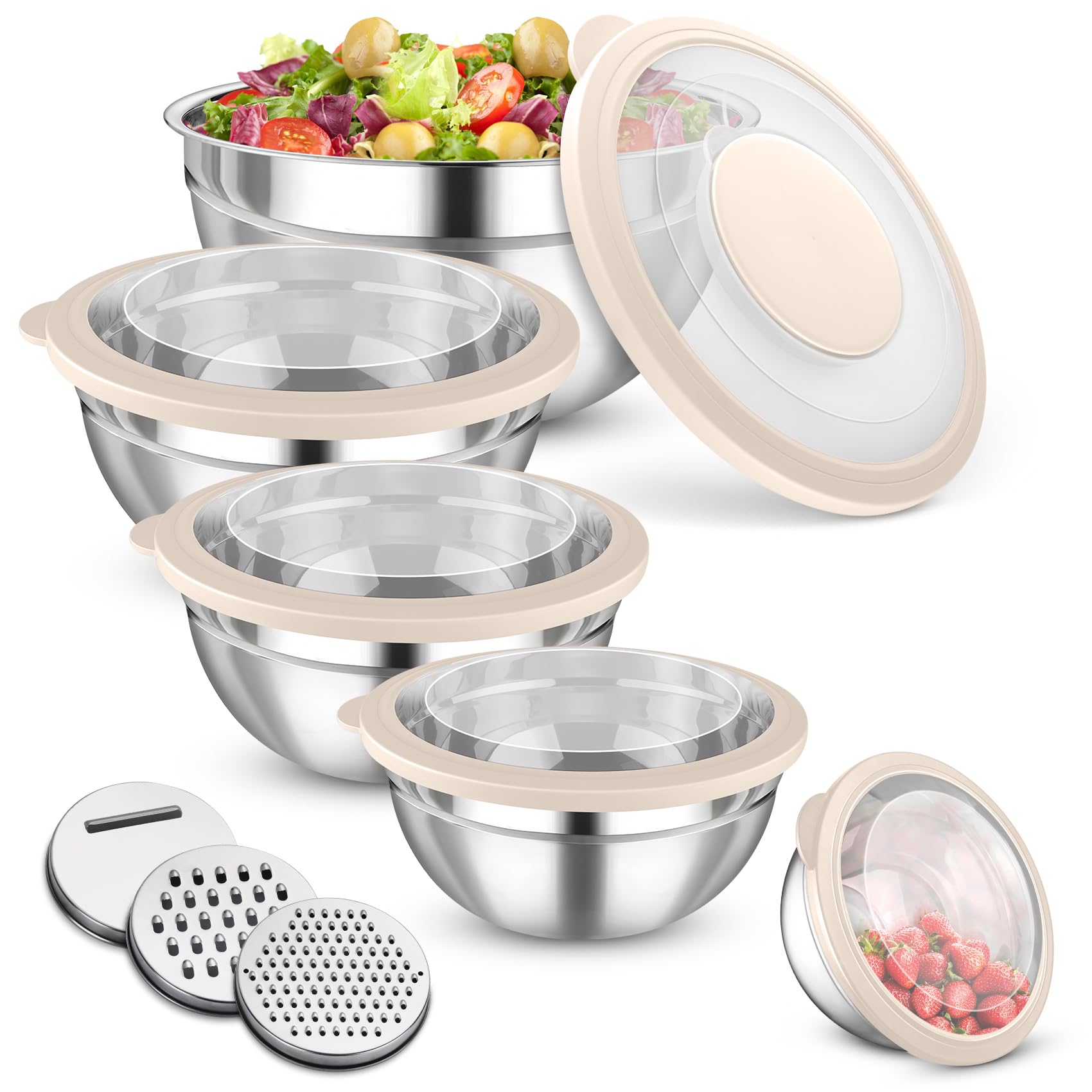 Rührschüssel 5er Set, Edelstahl Salatschüssel mit Deckel & 3 Reibeaufsätzen, Metall Servierschüssel für die Küche Mischen, Backen, 4,5L/3L/1,5L/1,2L/0,7L, Spülmaschinenfest, Khaki