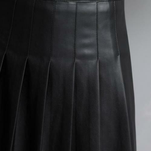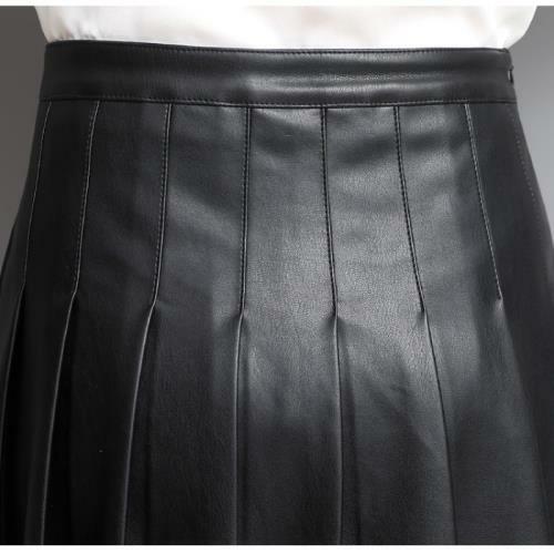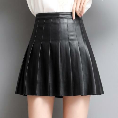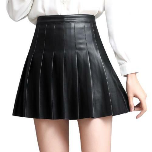 Women Genuine Leather Skirt Black Mini Pleated High Waist Slim A-line Skirt