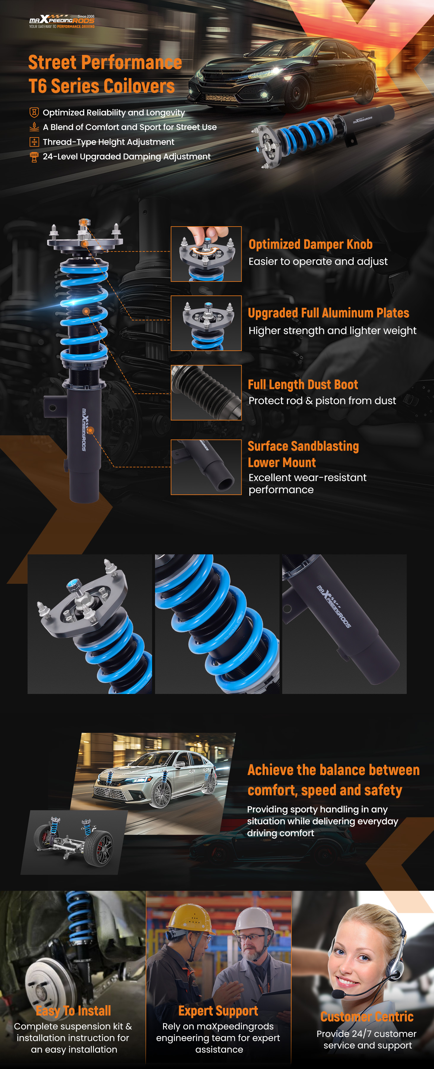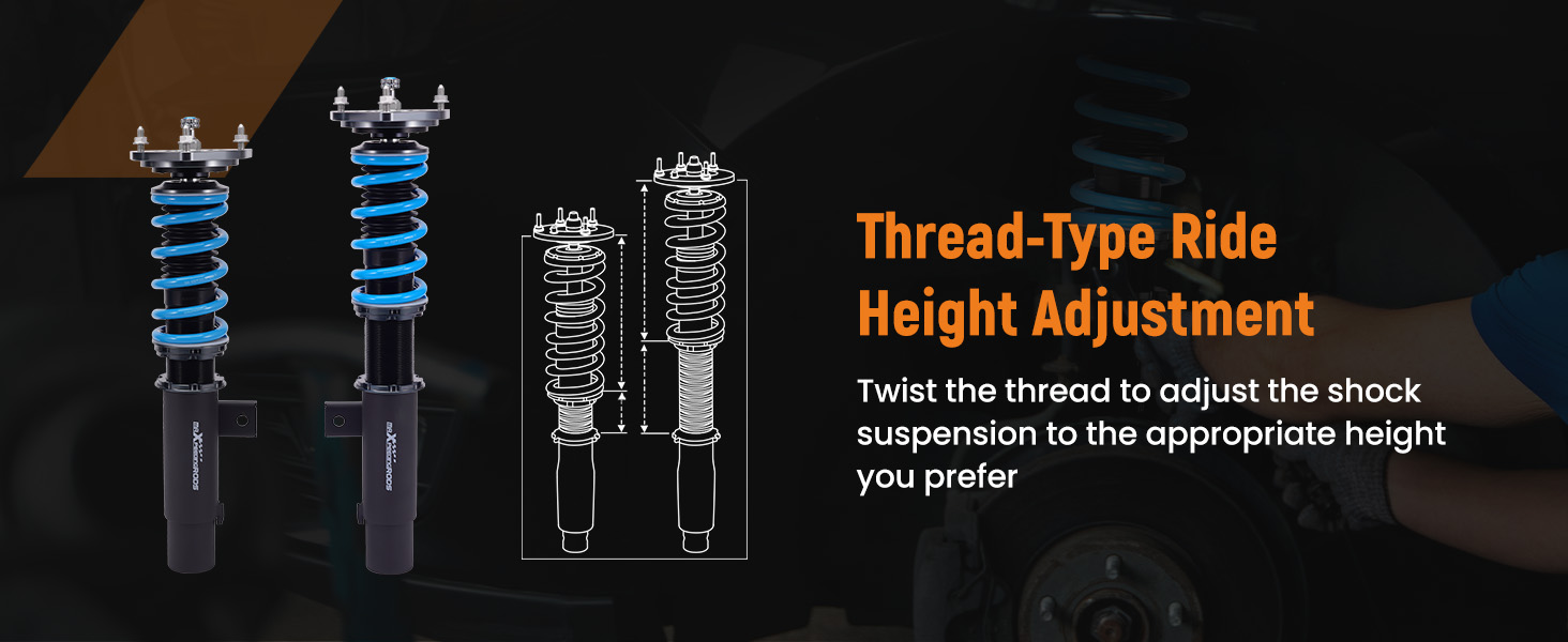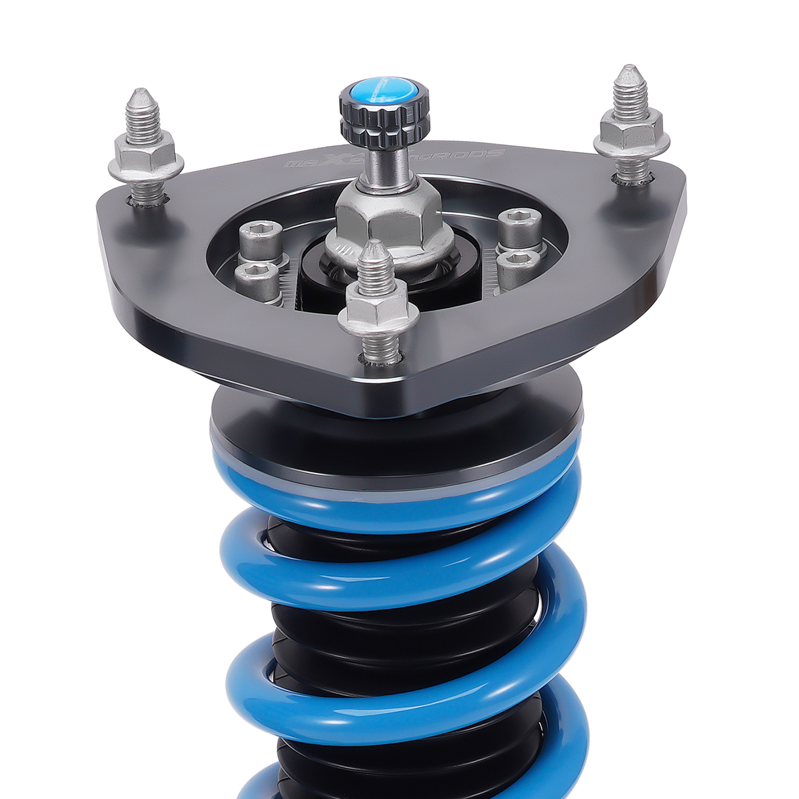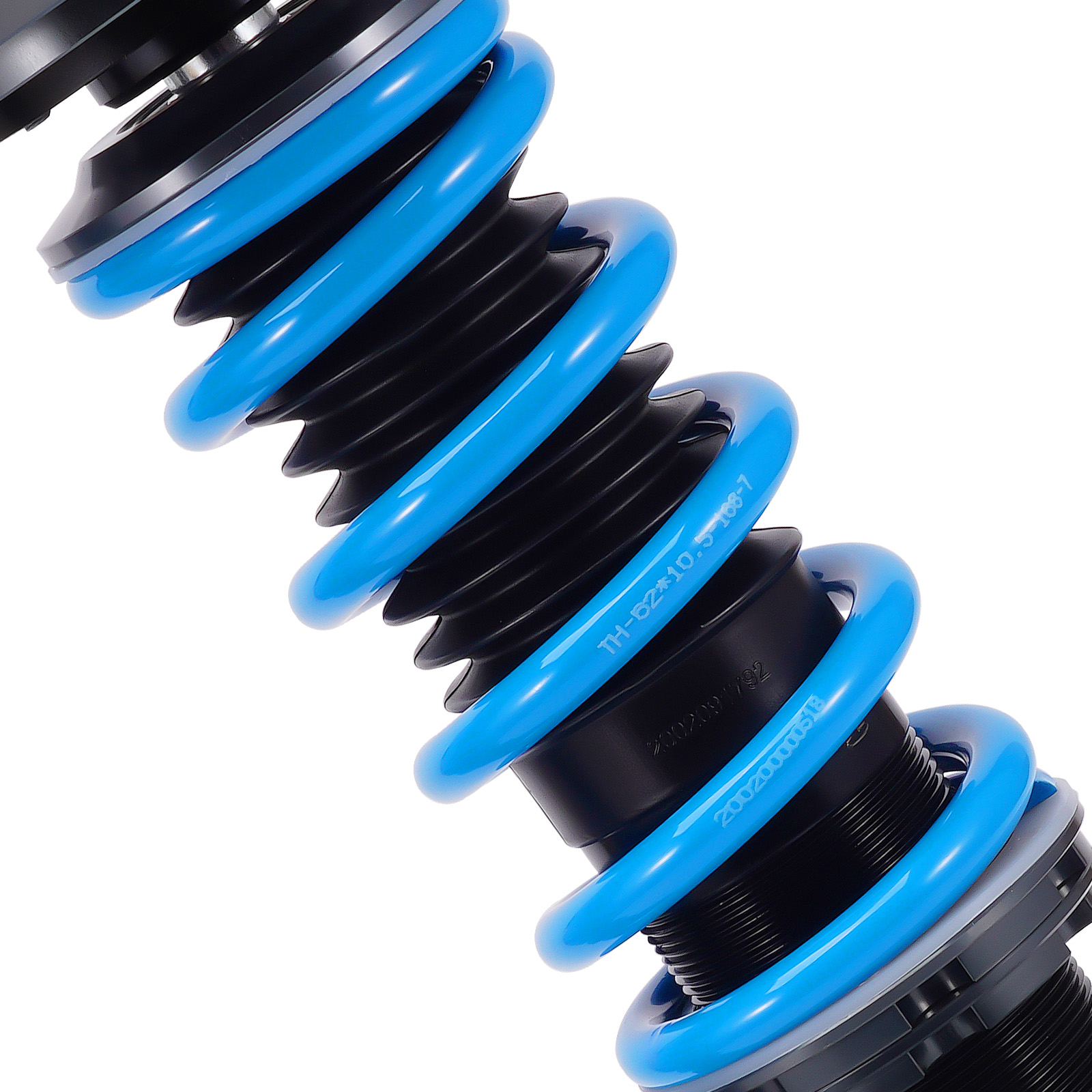 4. 24 Clicks of Rebound Adjustments -- This allows you the ability to perfectly dial in your coilovers system. For a nice comfortable driving, set damping to full soft. For more spirited driving, set it to 16 clicks. For occasional track days, set it to full stiff.