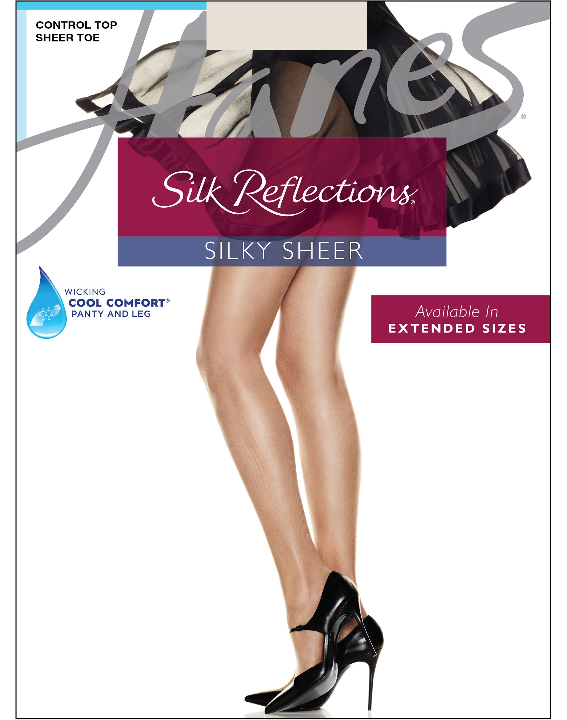Gorgeous sheer that's better than bare. You'll swear these are made of silk. Sleek knit fabric caresses every curve for a flawless fit. Control top waist contours for a smoother tummy, hips and rear. Sheer toe lets you sport your skimpiest sandals. Wicking Cool Comfort® fabric on panty to keep you feeling cool and dry. Great color selection for a better skin tone match. 15 denier sheer appearance. May be slightly imperfect.