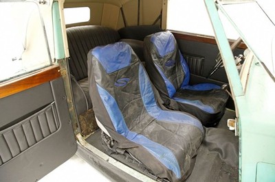 A swing of the suicide door and it appears a restoration has begun on at least the door panels. New wood sills and black vinyl panels have been put on and look fab! The remainder of the interior includes low back bucket seats, a restored and newer but dusty back seat, a wood dash which has also been restored, and rubber floors whose underpinning integrity are questionable. The factory large round plastic steering wheel is on and the central oval gauge cluster is intact and looking great. SO restoration has indeed begun and what was done is very nice.