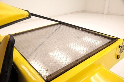Heavy and thick molded fiberglass in the form of a shell and tub for some interior seats and makes up this simplified body with floating fenders. Headlights, like bug eyes, protrude upwards from the inner fenders right next to the hood and a Mercedes-esque grille floats up front sandwiched between a faux radiator cap in chrome above and small chrome bumper below. An aluminum windshield frame is ever so slightly raked rearward and supports the front mounting for the yellow bikini top that covers the passengers. The upper body is a screaming yellow zonker and the bottom of the tub is black. The rear of this body is nice and high for the suspension travel and has small oval tail lights within aluminum bezels. Not oft seen is a polished diamond plate bed that when opened reveals the engine, fuel tank and battery. Dual zoom tubes for the exhaust emanating from either side add to the allue and custom look. Overall the yellow paint is in nice shape, however we do note a crack in the fiberglass around the passenger side headlamp and some rough cuts are noted in the edges of the yellow fiberglass body. 14 and 15-inch chrome Cragar SST wheels are on all 4 corners and are wrapped in deep treaded staggered width blackwalls.
