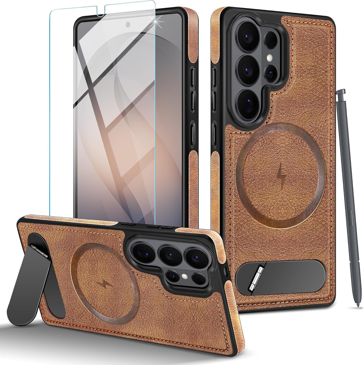 Magnetic for Samsung Galaxy S26 Ultra Case, Compatible with MagSafe, Slim Leather Built-in Screen Protector & Invisible Stand Anti Slip Shockproof Cover for Galaxy S26 Ultra 6.9" for Men, Brown