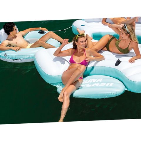The Intex Laguna Splash Island Floating Water Raft is designed for adults seeking a spacious and comfortable water lounging experience. This large inflatable raft includes two detachable solo lounge tubes that allow for individual floating or group relaxation. Crafted from extra-thick sport gauge PVC vinyl, it offers superior durability and puncture resistance for extended use. The raft features comfortable oversized backrests and mesh bottoms to keep you cool on hot days. Four built-in cupholders provide convenient beverage access while durable grab handles and an all-around grab line ensure safety and ease of boarding. The raft supports up to 880 pounds total weight capacity, with each solo tube supporting up to 220 pounds. Easy-to-use connectors keep the island and lounges securely attached so everyone stays close by. A repair patch is included for added convenience. Ideal for pools, lakes, or rivers, this floating water raft combines comfort, durability, and functionality for endless summer enjoyment.