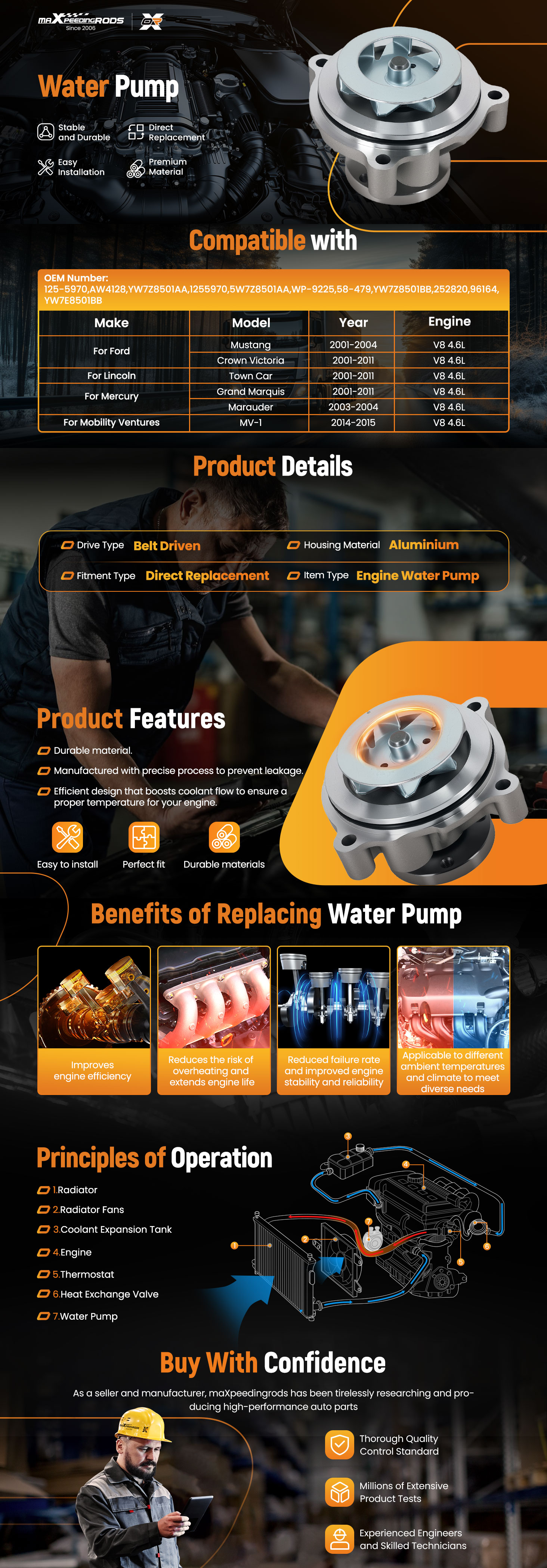 Title : Cooling Water Pump for Ford Mustang/Crown Victoria 4.6L 2001-11 YW7E8501BB