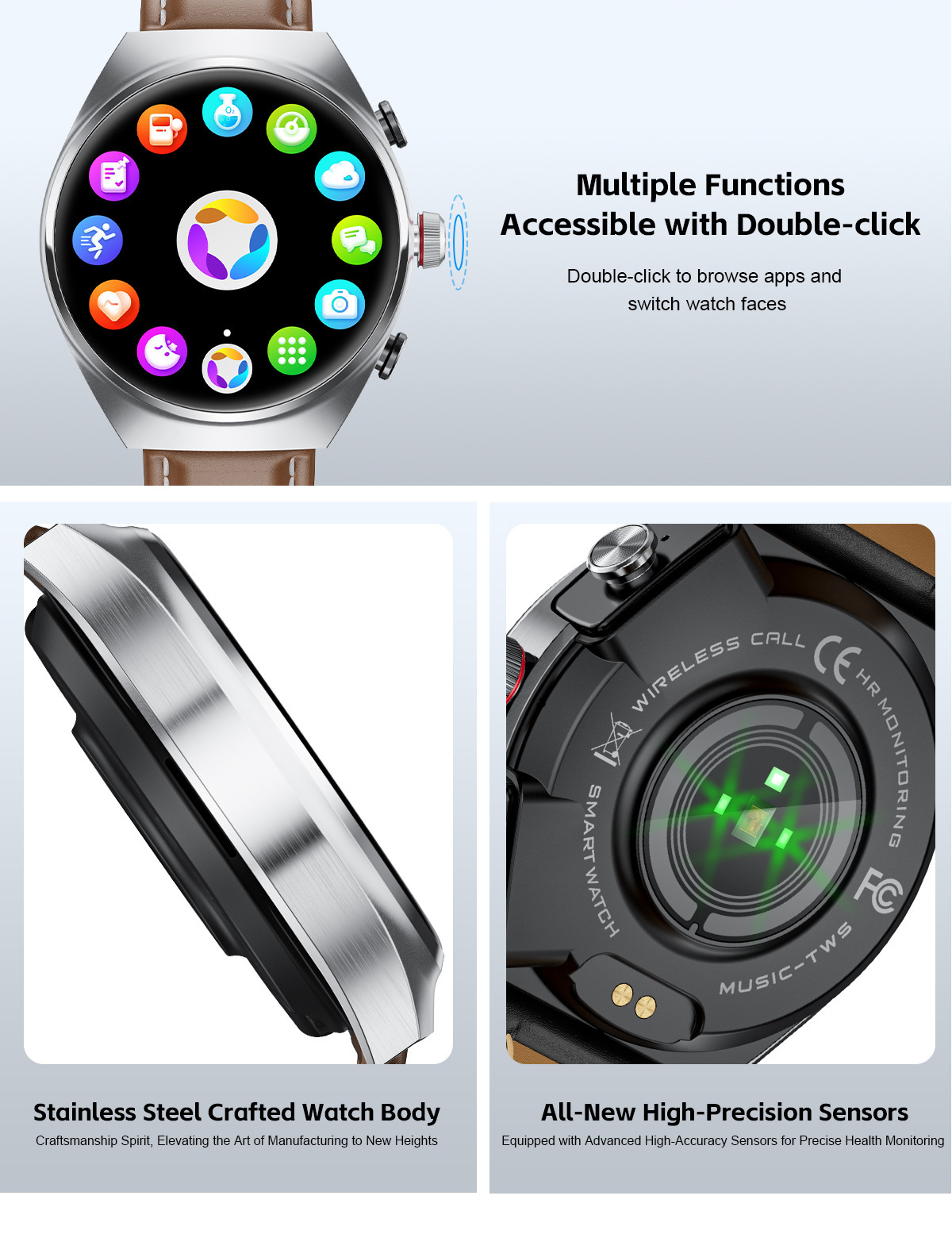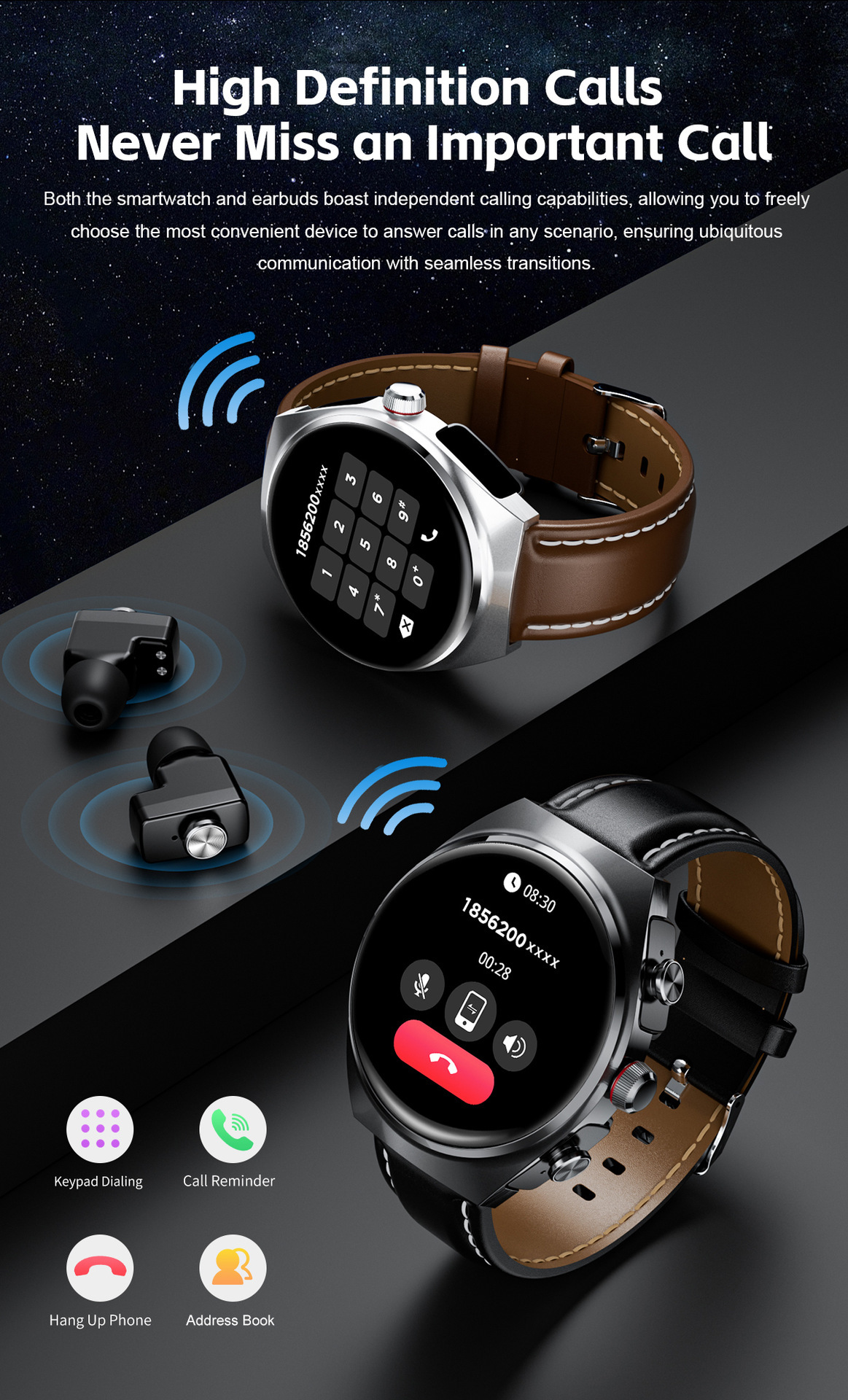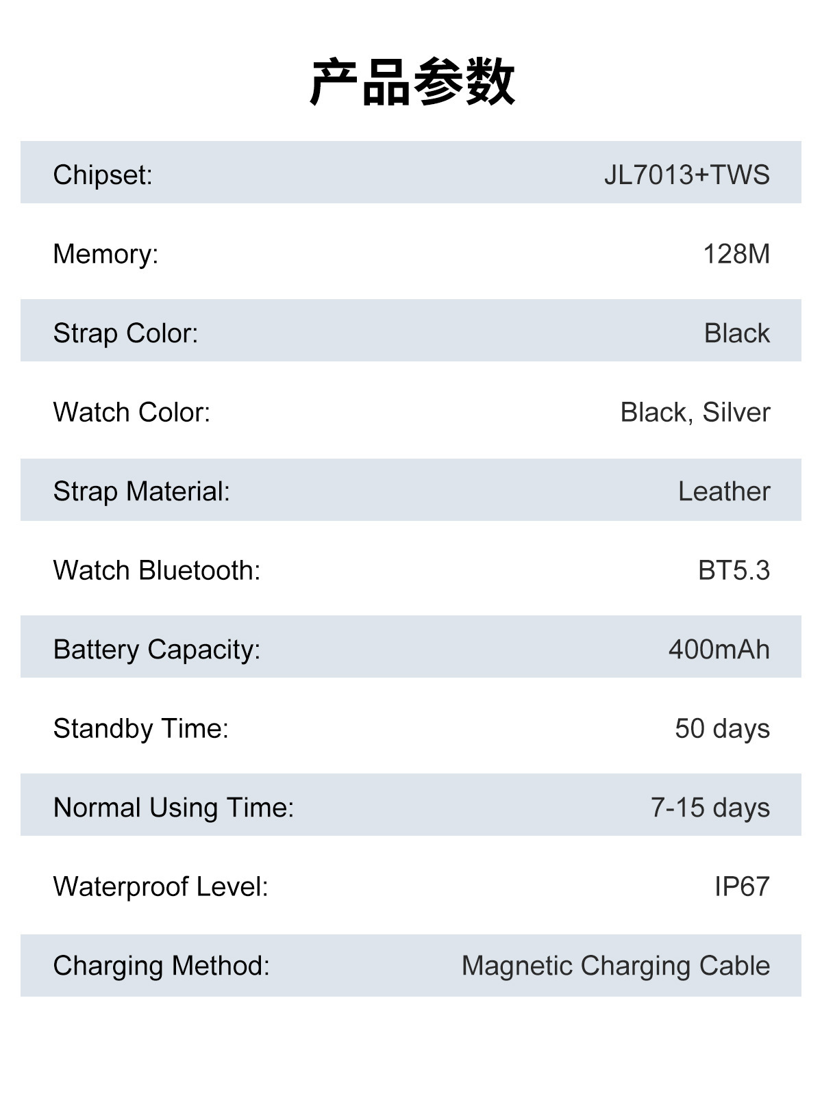 Functions: wireless TWS Bluetooth headset, high definition large screen, super signal stainless steel craft watch body, dual channel wireless call, music control, long standby, voice assistant, stopwatch, calculator, multi-function NFC, dynamic monitoring, real 24h health monitoring, sleep monitoring, multiple exercise modes, IP67 waterproof.