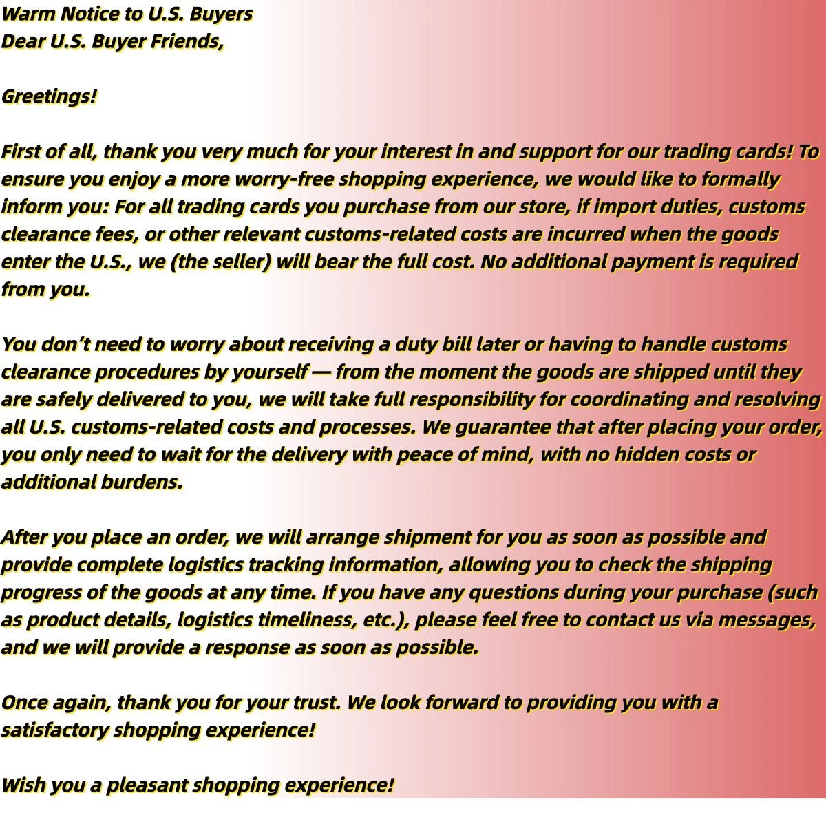Returns are NOT accepted for any sealed products (e.g,booster boxes,factory-sealed packs)once opened, inorder to maintain authenticity and product value.Card lots and single cards are visually inspected and carefully packed, but may not always match eBay'strict "Near Mint" standards. lf you're unhappy with the condition, feel free to message us- we'l do our best to work out a fair solution. To ensure smooth processing of any issues, please record an unboxing video and take photos immediately upon opening.