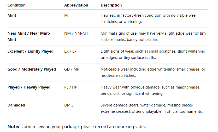 Returns are NOT accepted for any sealed products (e.g,booster boxes,factory-sealed packs)once opened, inorder to maintain authenticity and product value.Card lots and single cards are visually inspected and carefully packed, but may not always match eBay'strict "Near Mint" standards. lf you're unhappy with the condition, feel free to message us- we'l do our best to work out a fair solution. To ensure smooth processing of any issues, please record an unboxing video and take photos immediately upon opening.