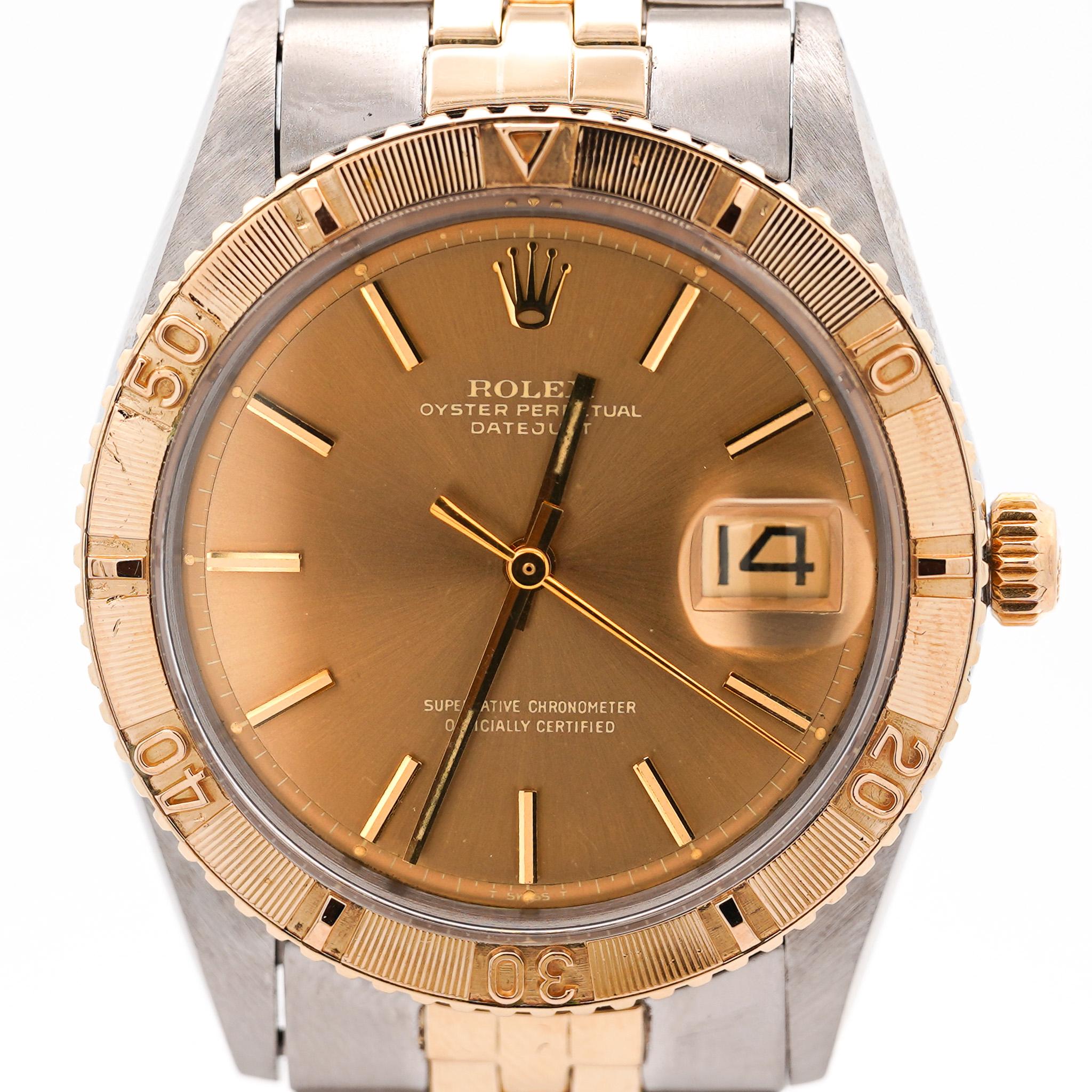 The reference 1625 Thunderbird is distinguished from the standard Datejust by its most defining feature — the bidirectional rotating engine-turned yellow gold bezel with graduated minute markings, a functional complication that allowed the wearer to track elapsed time independently of the main hands. The 36mm two-tone case pairs a polished stainless steel body with yellow gold crown, bezel, and Jubilee bracelet center links, creating the warm visual balance that defines the golden era of Rolex two-tone watchmaking in the 1970s. The champagne sunburst dial deepens to a warm bronze under different light conditions, its applied gold baton indices and date window at 3 o'clock completing a dial composition that has aged with exceptional grace over the past half century.