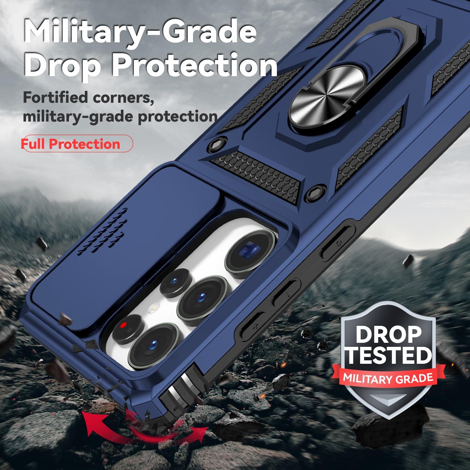 for Samsung Galaxy S25 Ultra Case with Slide Camera Cover HD Screen Protector [Military Grade Drop Tested] Magnetic Ring Holder Kickstand Protective Phone Case for Galaxy S25 Ultra 5G 2025, Navy Blue
