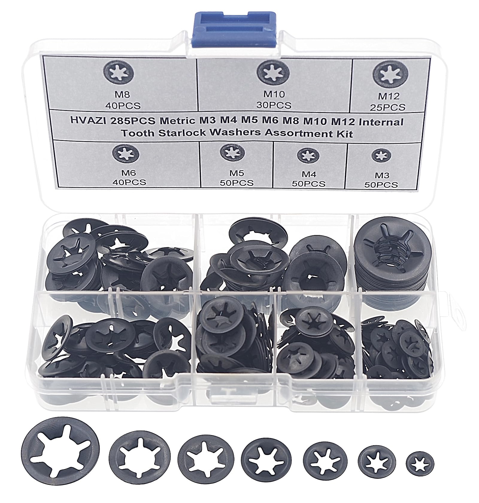 Product description:These rings hold attachments firmly in place by gripping the shaft OD. Use them on unhardened shafts that have a hardness less than the hardness of the push ring. Metal must be soft enough for ring to form an interference grip to hold properly.The Starlock Washers have teeth that dig into the shaft material, so expect minor scratching.Package include:285pcs 7 Kinds Metric Push On Washers Starlock Washers Assortment Kit;Come with the plastic box:List(Type,ID*OD,Quantity):Starlock Washers M3(3mm)*9mm 50pcs;Starlock Washers M4(4mm)*12mm 50pcs;Starlock Washers M5(5mm)*14mm 50pcs;Starlock Washers M6(6mm)*16mm 40pcs;Starlock Washers M8(8mm)*18mm 40pcs;Starlock Washers M10(10mm)*20mm 30pcs;Starlock Washers M12(12mm)*25mm 25pcs;Packing contents:HVAZI 285PCS Metric M3 M4 M5 M6 M8 M10 M12 Internal Tooth Starlock Push On Washers Assortment Set Packed in a plastic box