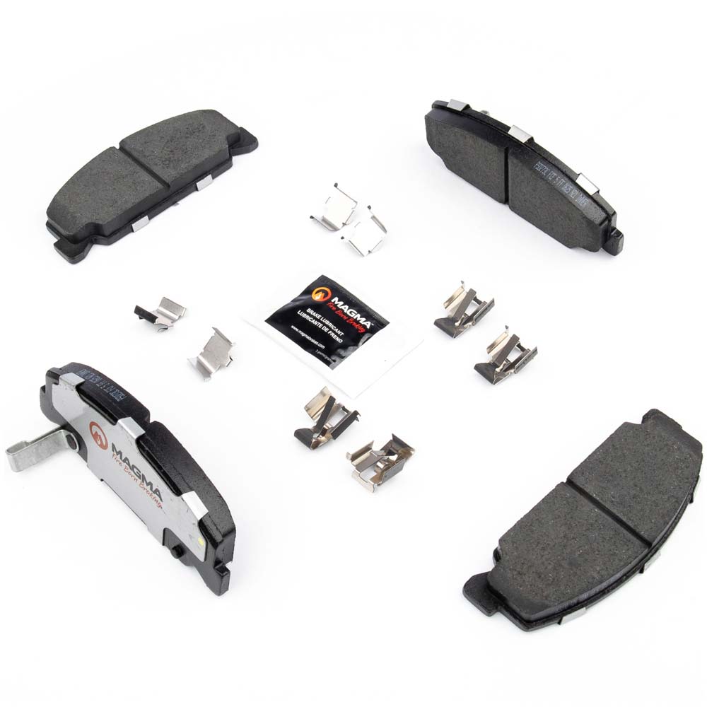 WHY MAGMA? - Today's harsh stop and go environment can create very high heat levels in your braking system which can reduce the vehicle's ability to stop. Extreme high temperatures can be reached in many braking situations such as - Stop and Go Traffic, Mountain Driving, Hauling or Towing, Emergency Stops, Spirited Driving and Long, Sustained Braking. At MAGMA Brakes, we use FIRE to fight FIRE. Our brake system components are made using advanced, state of the art techniques and treatments that ensure our brakes will stand up to the heat.MAGMA Pro-Series brake pads feature...1. Scorched, copper free friction formulations for overall ltimate braking performance2. Vulcanized OE style rubber core shims for unsurpassed noise suppression3. Heat-tempered upgraded dual-coated stainless steel hardware kits to restore the brake pad to caliper interface to ""like new"" condition (where applicable)4. Heat expansion OE style slots and chamfers to dissipate noise and stand up to the heat5. High-heat resistant brake lubricant included for lubricating critical points during pad installation