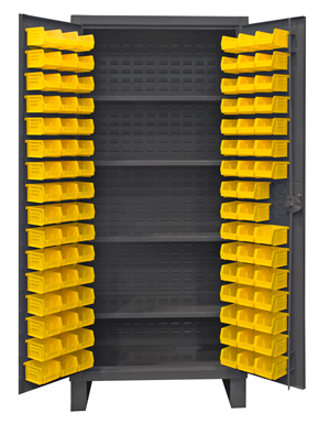Extra heavy duty 12 gauge cabinet with hook on bins. 3 point locking system with pad lockable cast steel locking handle. (padlock not included) Flush doors with 7 gauge leaf hinges to prevent sagging. The fully welded louvered panels help to reinforce the door and hold the hook on bins. 6" high base/legs provide access for forklifts to get underneath. Shelves bolt into place easily using fasteners provided and adjust on 2.25" centers.