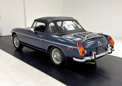 Patsy Cline sang, "why can't you be blue over me?" and this MGB answers with single stage Cosmic Blue Metallic paint. Over the course of production, MGB's were available in dozens of color choices and many blues and you can see why as it's a very nice color for the car, still providing a satin shine embellished by a polished body length trim piece, chrome bumpers, and 14-inch wire wheels. There's a robin's egg blue pinstripe wrapped around the car which meets a white pinstripe floral detail around the trunk latch and it's here where you'll find a chrome luggage rack for those weekend jaunts in the country. A newer black canvas top takes in three rear plastic windows, all in nice shape. The grille wears a red badge and frames black mesh in polished chrome, flanked by recessed headlights wearing matching polished rings. Imperfections include rust bubbling, touched up and untouched chips, scratches, and peeling paint in a seam.