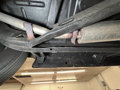 Nice and clean underneath with minimal surface rust and some slight residual oil on the pan and rear differential. A single exhaust threads the X-frame, runs through a stock style muffler, and exits out back through a steel pipe with decorative deflector. Drum brakes are at all four wheels and suspension consists of coil springs front and rear with semi trailing arms included.