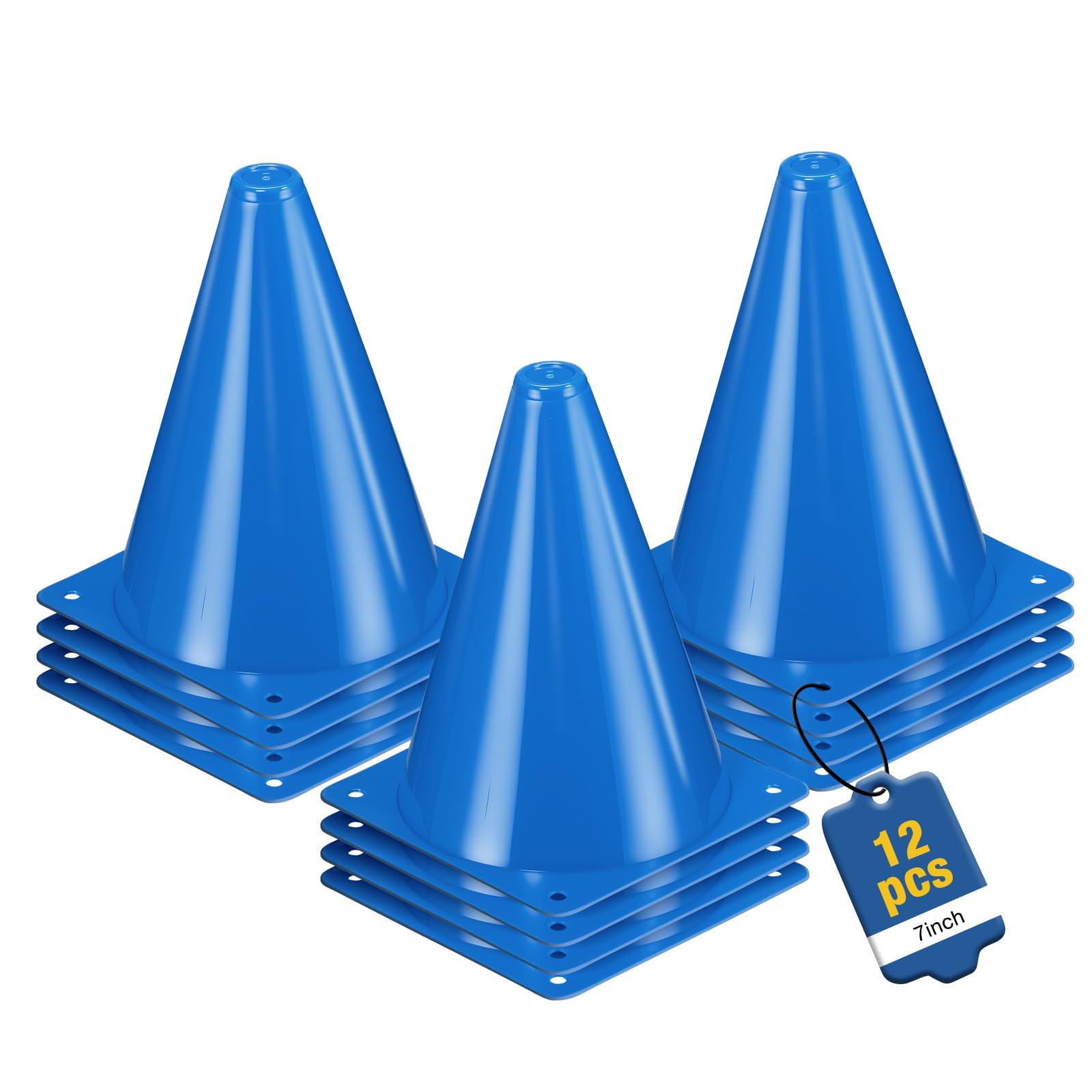 offers 12 count sets of durable 7 inch blue soccer cones for effective training. Each cone features a solid 7 inch height and 5.32 inch weighted base, ensuring consistent performance during drills and practice sessions