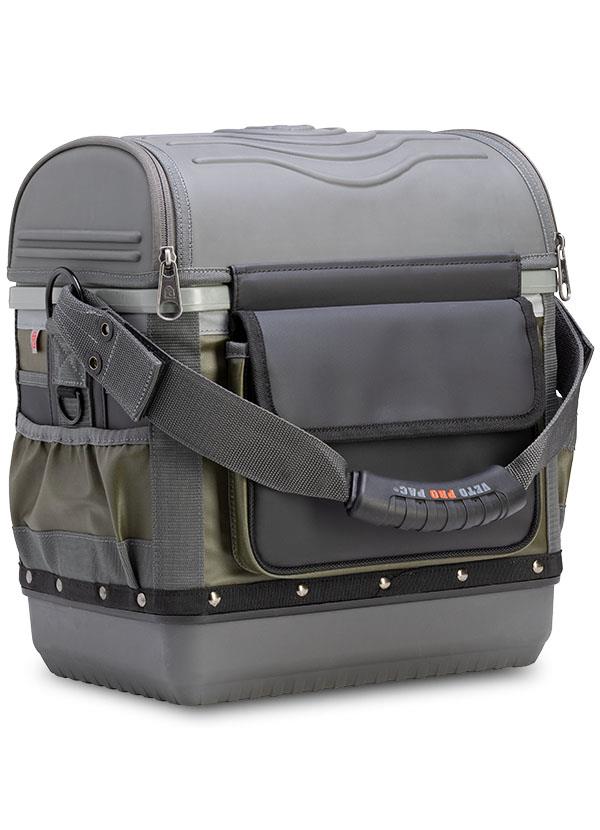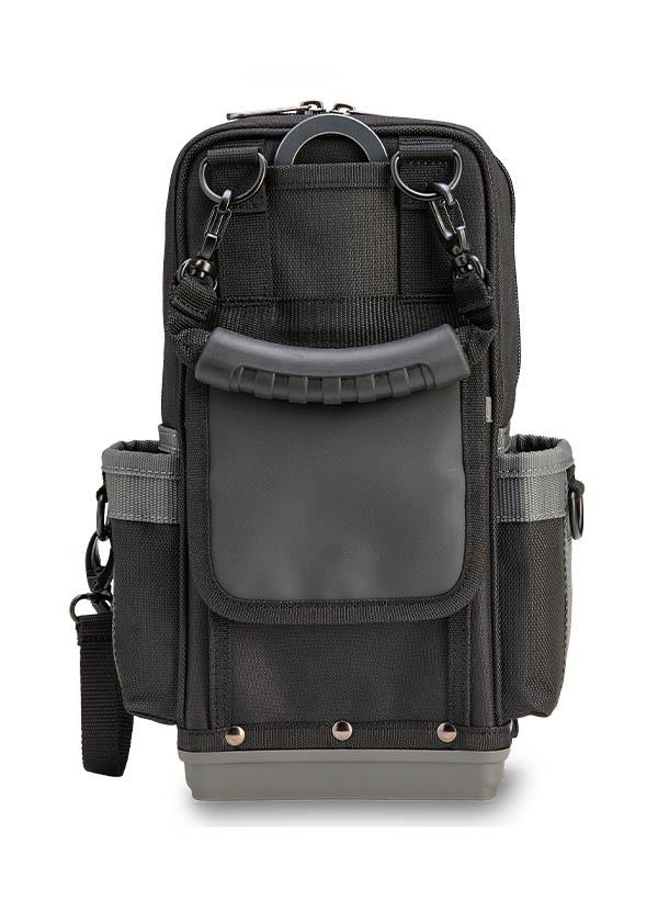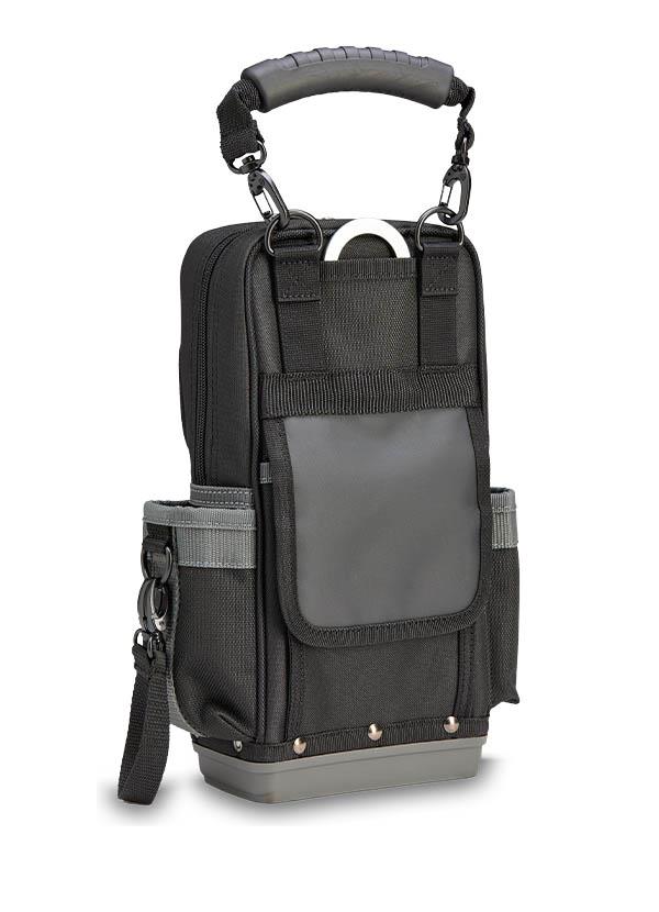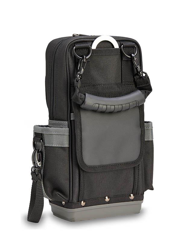 The MB2B is a tall, compact meter bag built on an impact- and water-resistant injection molded polypropylene base that keeps the bag upright while protecting your tools and test equipment in any environment. The main compartment accommodates two meters up to 12.5” tall, while the large front access sleeve pocket provides convenient storage for hand tools. The bag also features a rear water-resistant pocket ideal for storing leads or probes, and an integrated hang-up hook that keeps the bag elevated, off the ground, and within easy reach.