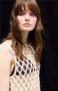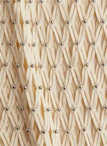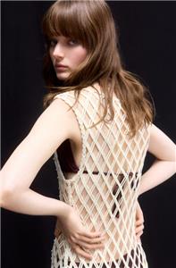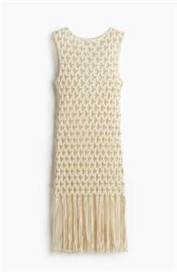 Sleeveless, calf-length net dress with silver-colored beads at front. Braided trim at neckline and armholes and long fringe from thigh to hem. Unlined.