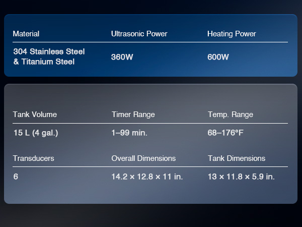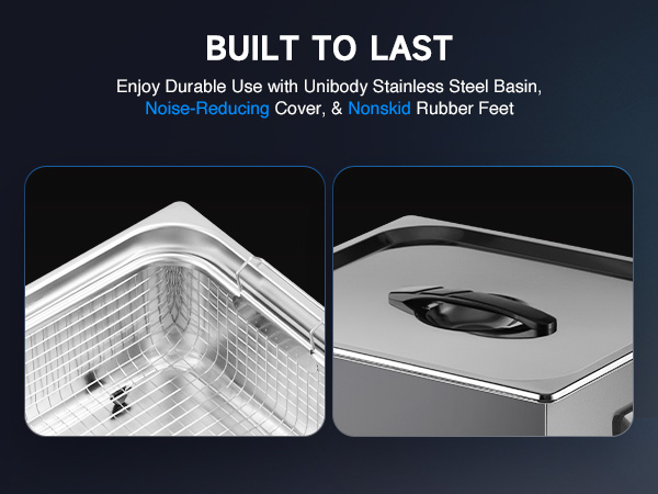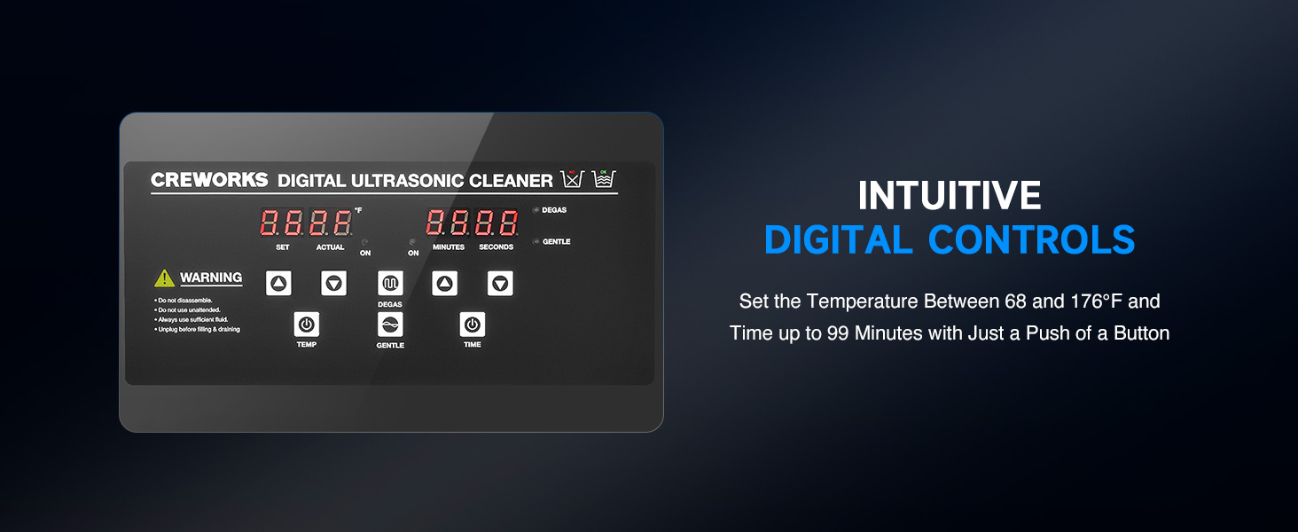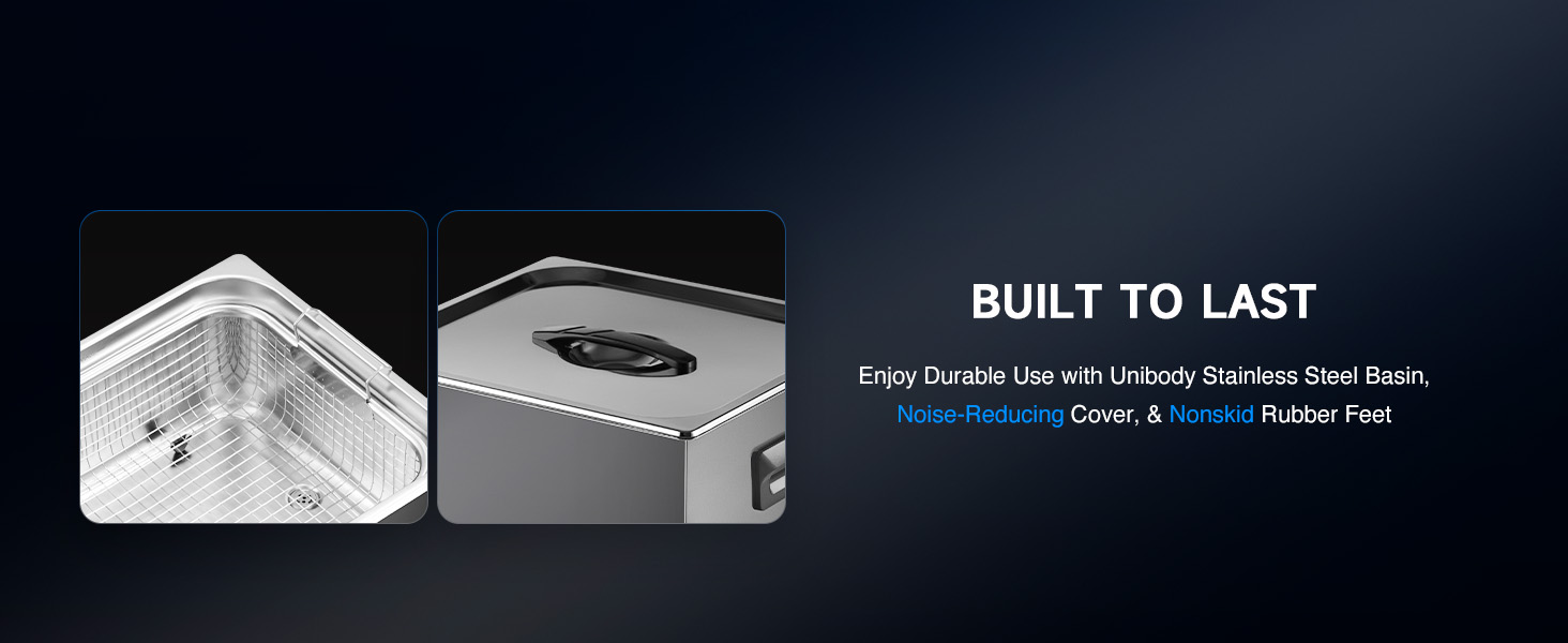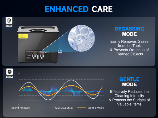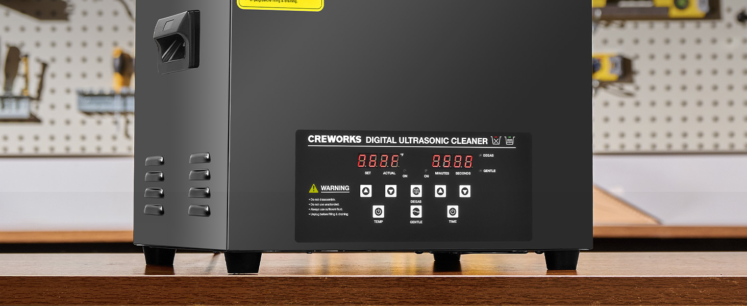 This industrial-strength ultrasonic cleaner is built to outperform and outlast the competition with its reinforced stainless steel tank walls, perfectly gentle yet thorough 40kHz sound wave cavitation, and intuitive control panel. The degas and gentle cleaning modes are specifically engineered to protect your delicate and valuable items.