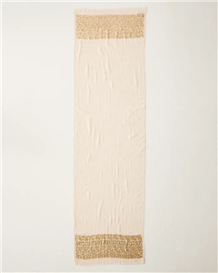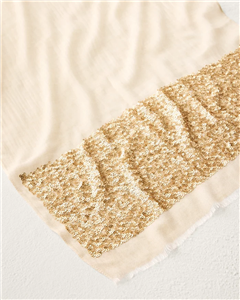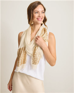 Add warmth—and a hint of sparkle!—to your look with this soft wrap scarf, complete with festive gold sequin embellishments on either end.