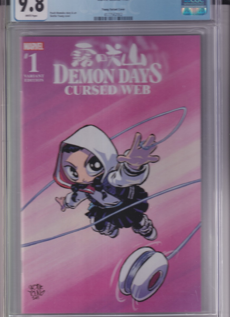 This is close to mint with some minor defects. Even though some defects are allowed in 9.6 certain defects, such as tape, are never allowed in this grade range. Slight stress on the spine. The staples themselves are generally centered clean with no discernible rust. Maybe some minor color has chipped or flaked off the cover. The cover is flat with no surface wear. Inks are bright with high reflectivity and very little fading. Square and sharp corners with ever so slight blunting permitted. You can tell that this comic has been stored properly and looks almost as new as the day it was printed. The smallest amount of creasing. All bindery tears are small. Only some binding and/or printing defects allowed. Cover is fairly well centered and firmly secured to interior pages. Paper is supple and like new. Spine is tight and flat. Unobtrusive date stamps or arrival dates in pencil or ink are acceptable. Many pedigree collection comics have a notation on the cover or the interior of the comic and are considered a bonus to collectors as they help prove the provenance of the comic |