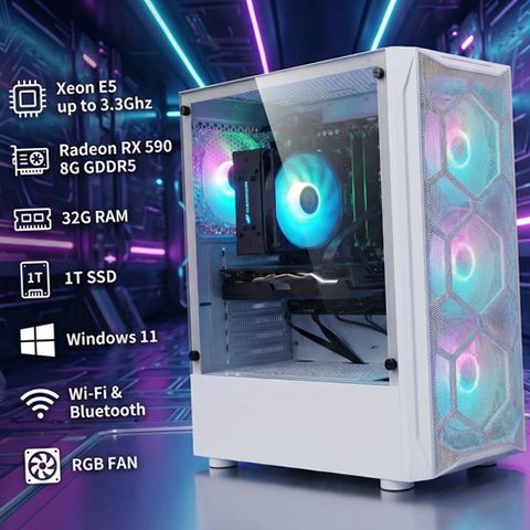 Experience high-performance gaming and multitasking with the STGAubron Gaming Desktop PC featuring an Intel Xeon E5 processor with 10 cores running up to 3.3GHz. This system is equipped with 32GB of DDR3 memory to handle demanding applications and seamless gameplay. The fast 1TB solid state drive provides ample storage space with quick data access speeds, reducing load times significantly. Graphics are powered by the AMD Radeon RX 590 video card with 8GB of GDDR5 memory, delivering detailed visuals and smooth frame rates for an immersive gaming experience. Connectivity options include HDMI, DisplayPort, USB ports, RJ-45 Ethernet, high-speed WiFi adapter supporting up to 600M, and Bluetooth 5.0 for wireless peripherals. The desktop features multiple RGB fans for efficient cooling and customizable lighting effects that enhance the aesthetic appeal of your setup. Included accessories such as an RGB gaming mouse and keyboard complete the package for immediate use. Operating on Genuine Windows 11 Home 64-bit ensures compatibility with the latest software and games while providing a user-friendly interface suitable for gaming, streaming, content creation, and professional tasks.