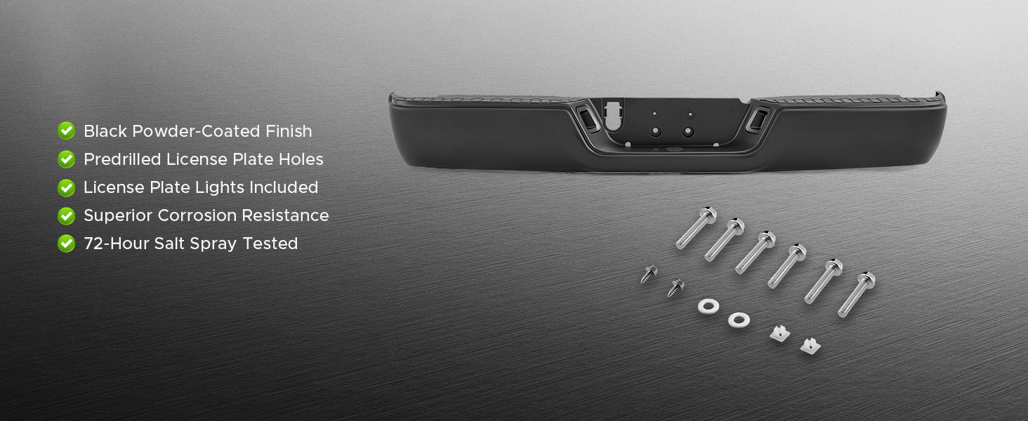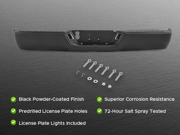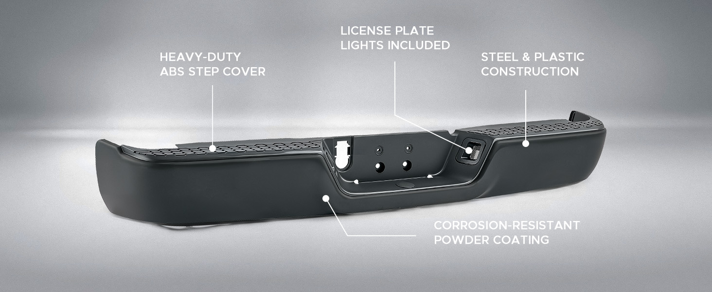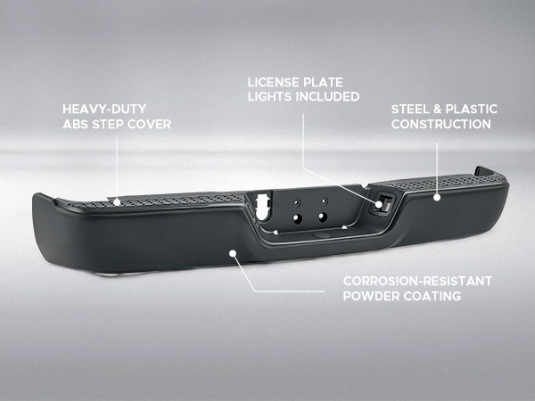 Made from high-strength steel, this premium rear step bumper absorbs impact, shielding your truck from dents, scrapes, and costly damage while maintaining its rugged appearance. The black powder-coated finish resists corrosion, keeping your rear bumper assembly looking new through all kinds of weather. Plus, the included license plate lights ensure your plate stays visible and road-legal even at night.