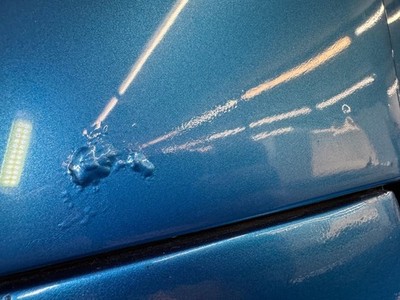 Fantastic rounded edges of the Ford's profile are accentuated by the two stage Medium Blue paint here and that paint is accentuated itself by a white and yellow stripe down the side and V8 graphic on the hood. A bit of chrome offsets the blue and is found on the bumpers, tailpipes, grille, spot lights, and 15-inch SSC wheels. The car hunkers down over the tall sidewall tires, especially in the back where the flared fenders hug the entire top of the rubber. Tail lights look positively diminutive amongst the big, rounded decklid while stand alone headlights cap a flat topped fender flanking a rising hood. Imperfections in the paint include chips, dents, scuffs, and scratches throughout, and some blistering.