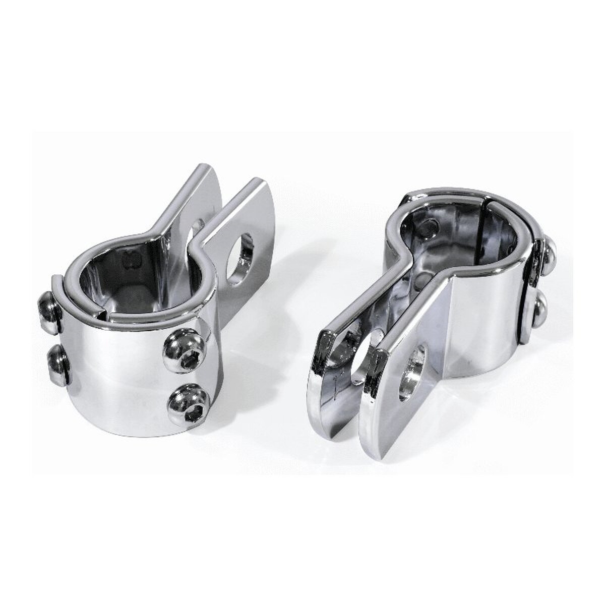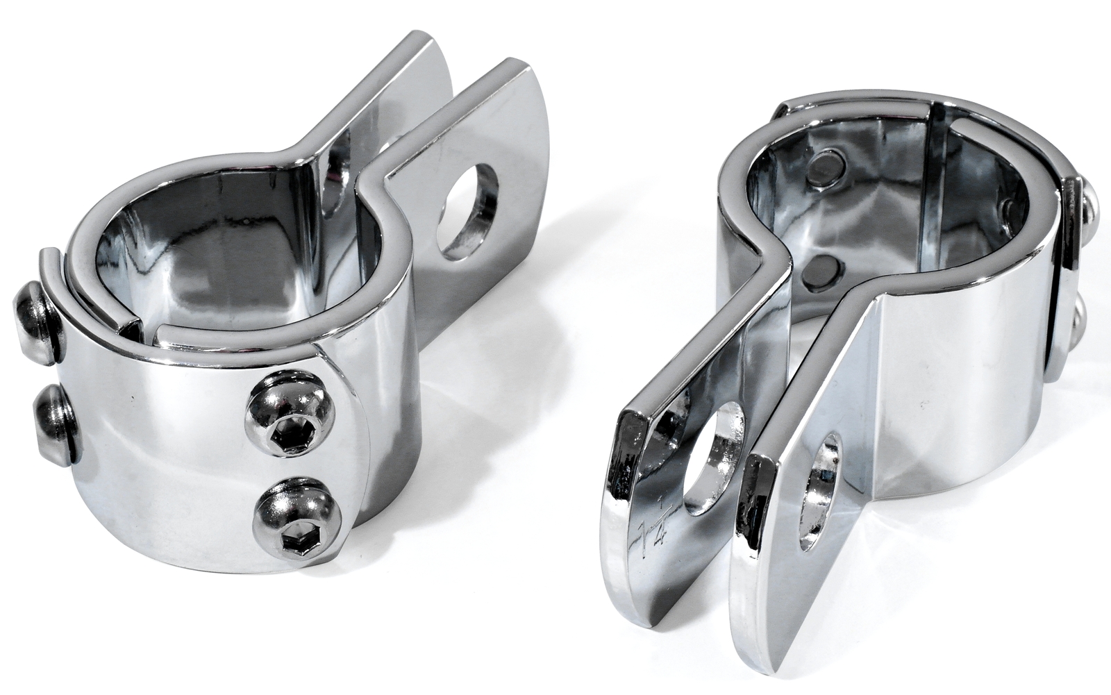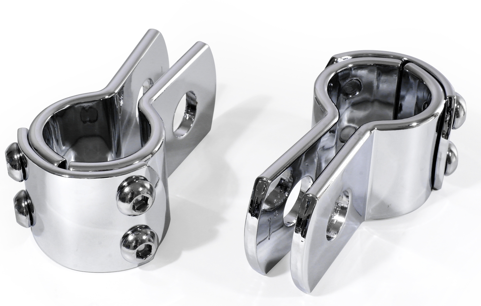 Support de montage chromé en 3-pièces avec une qualité solide et une bonne finition avec un diamètre de 1½" (38 mm). Le trou pour la fixation aux pattes a un diamètre de 1/2" (12,9 mm). Pour une fixation en douceur au cadre, à la barre de protection ou à d'autres options de fixation. Le prix est par pièce / par pince. D'autres tailles ainsi que des versions noires sont disponibles chez nous