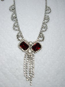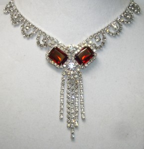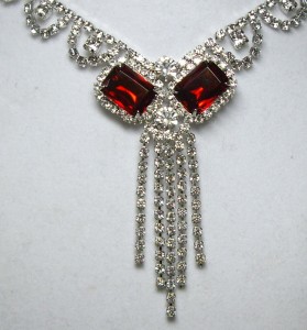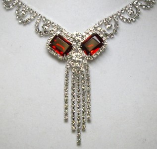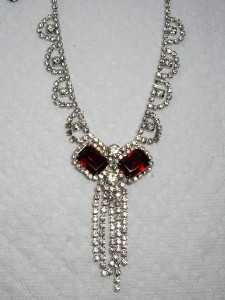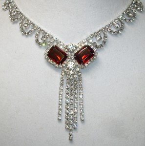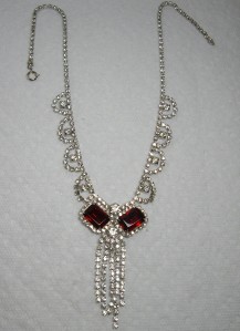 HIGH END~Vintage Emerald Square Cut Ruby Red Color Crystal & Rhinestone Drippy Necklace