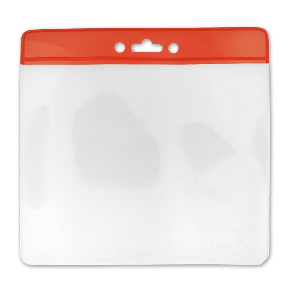 This Large Sized Vinyl Badge Holder features a red colored top tag and small holes at it's top for attaching lanyard pins or dual ended lanyards. It has a 5/8" top center slit to attach one our our lanyards with a swivel thumb hook, or bulldog clip to. This is perfect for someone who needs access to their ID at all times. It fits a card the size of 4-1/2"W x 4"H, ideal for business conventions, meetings, sports events, concerts, military, trade shows, businesses, schools, and general use purposes. *Pin and lanyard is not included; it is shown for reference only.