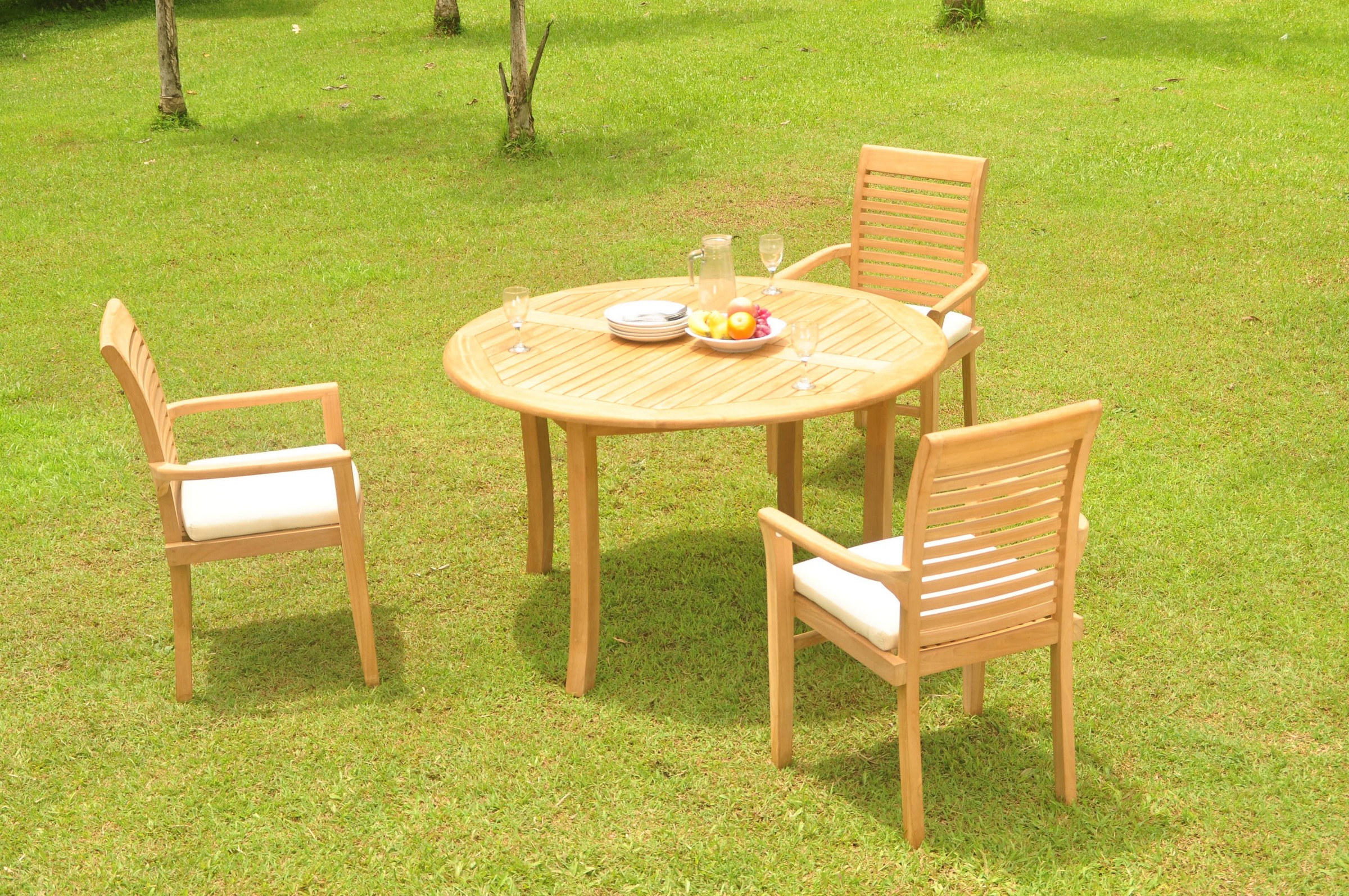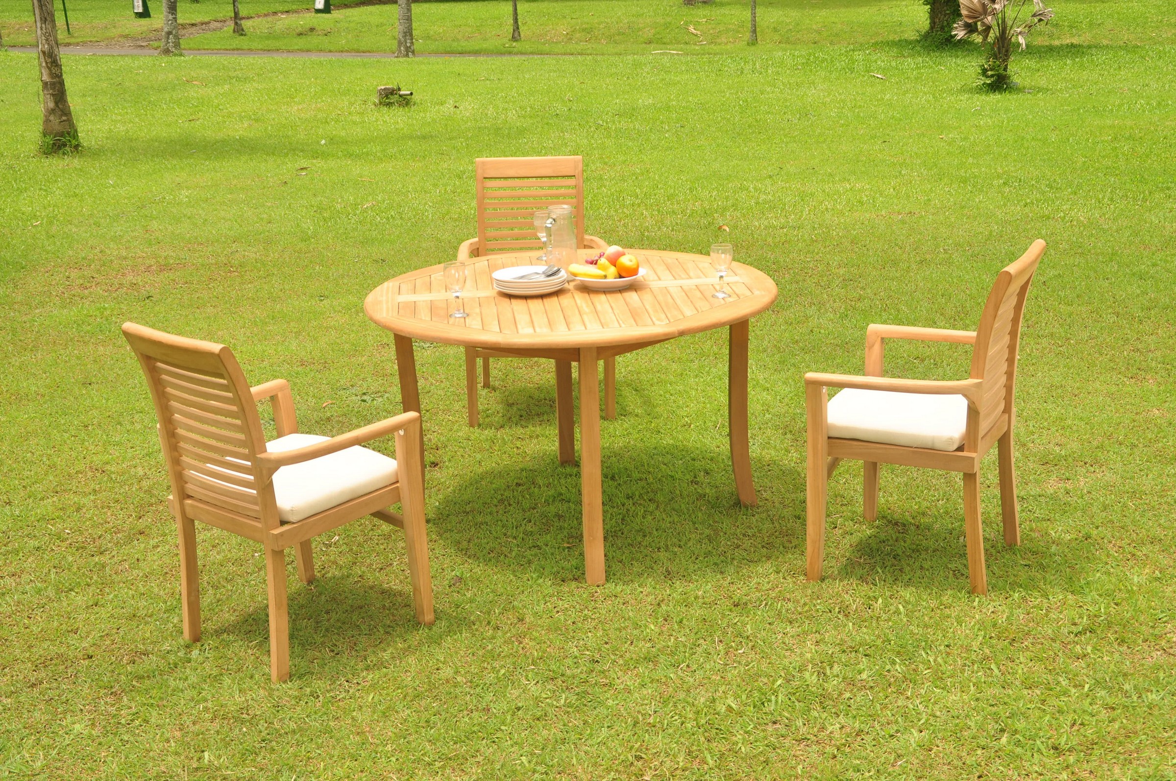 Set includes: 52" Round Table and 3 Mas Stacking Arm Chairs. Pictures shown with more chairs is for illustration purpose only. You will receive only 3 chairs. ** Wood Umbrella Hole Plug is also provided. ** 2" Umbrella Hole is available in the middle of the table. ** Umbrella is not included with the set, but can be purchase separately, please inquire. ** DON'T FORGET TO ENQUIRE ABOUT OUR SUNBRELLA CUSHIONS (SOLD SEPARATELY) ** If you need more chairs, please let us know. ** Assembly: Very little assembly is required. This furniture will be delivered in partially assembled sections. Assembly is quick and simple. **Accessories shown in picture are not included with the set. Please inquire if you are interested.