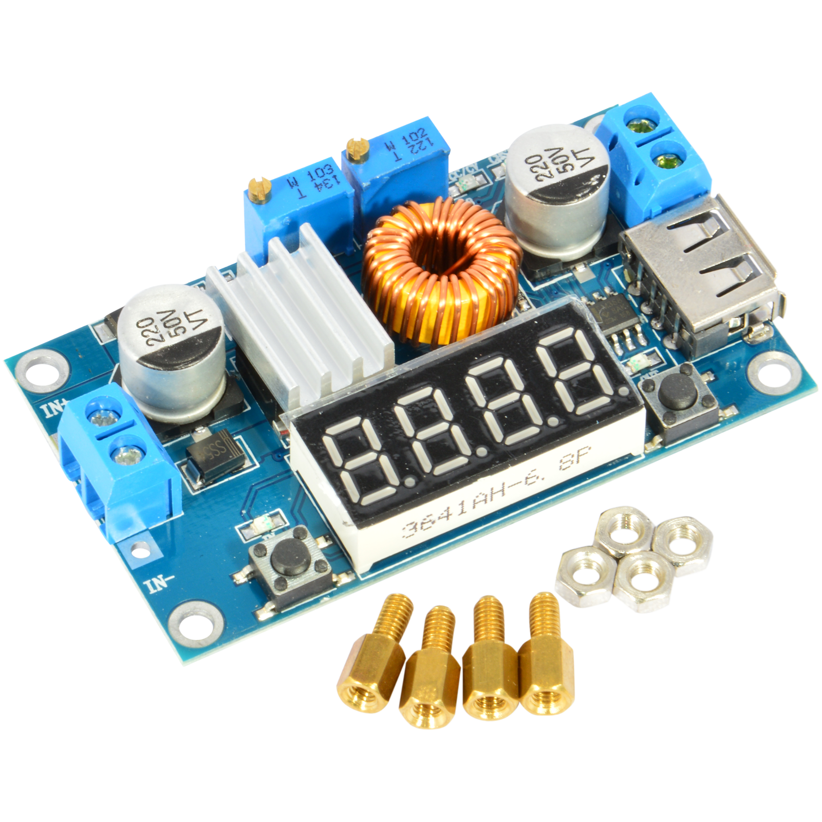 This module combines the high efficiency XMLSEMI XL4005 DC-DC buck converter IC with a TI LM358 Op-Amp for stable current regulation. The built in voltmeter makes for simple installation and adjustment and helps to monitor the supply or device power. The voltage and current limits are adjusted using potentiometers. A small button switches the voltmeter between input and output.